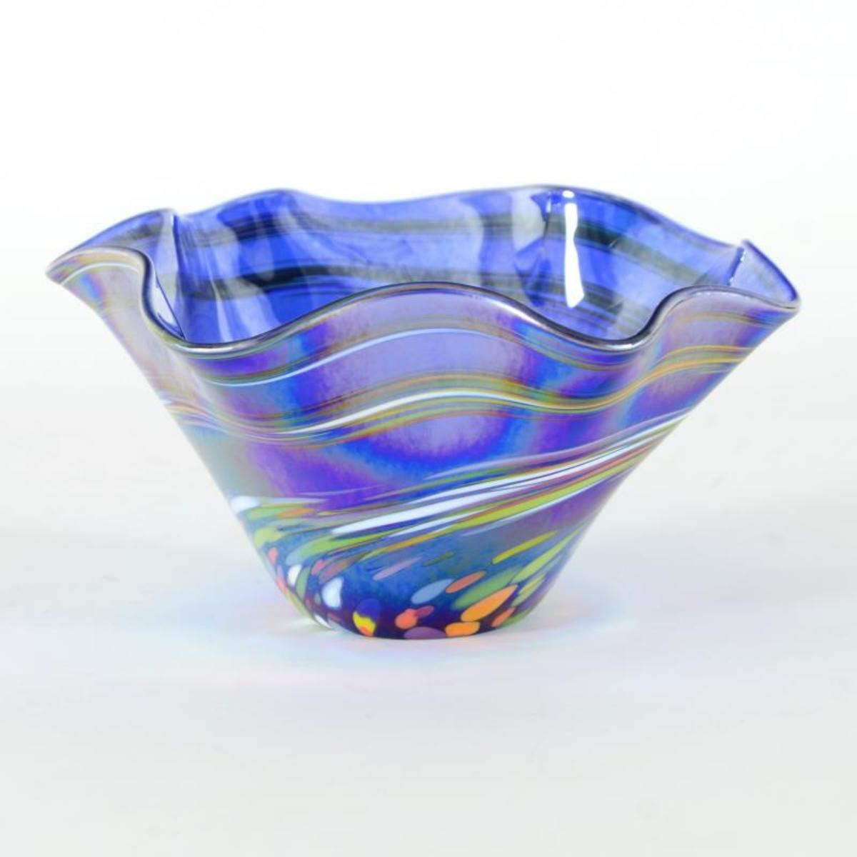 Glass Eye Studios, "Mini Wave Bowl (Blue Rainbow Twist)" Hand Blown Glass Sculpture (Second).