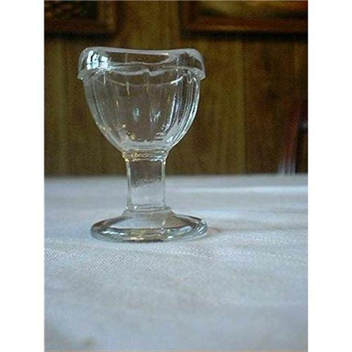 Eye wash cup is made of glass and has a ribbed pattern on the sides of the cup and stem. The eye wash cup is unmarked and measures 2.5 inches high and 1.5 inches wide. The cup is in good condition and no chips or cracks.