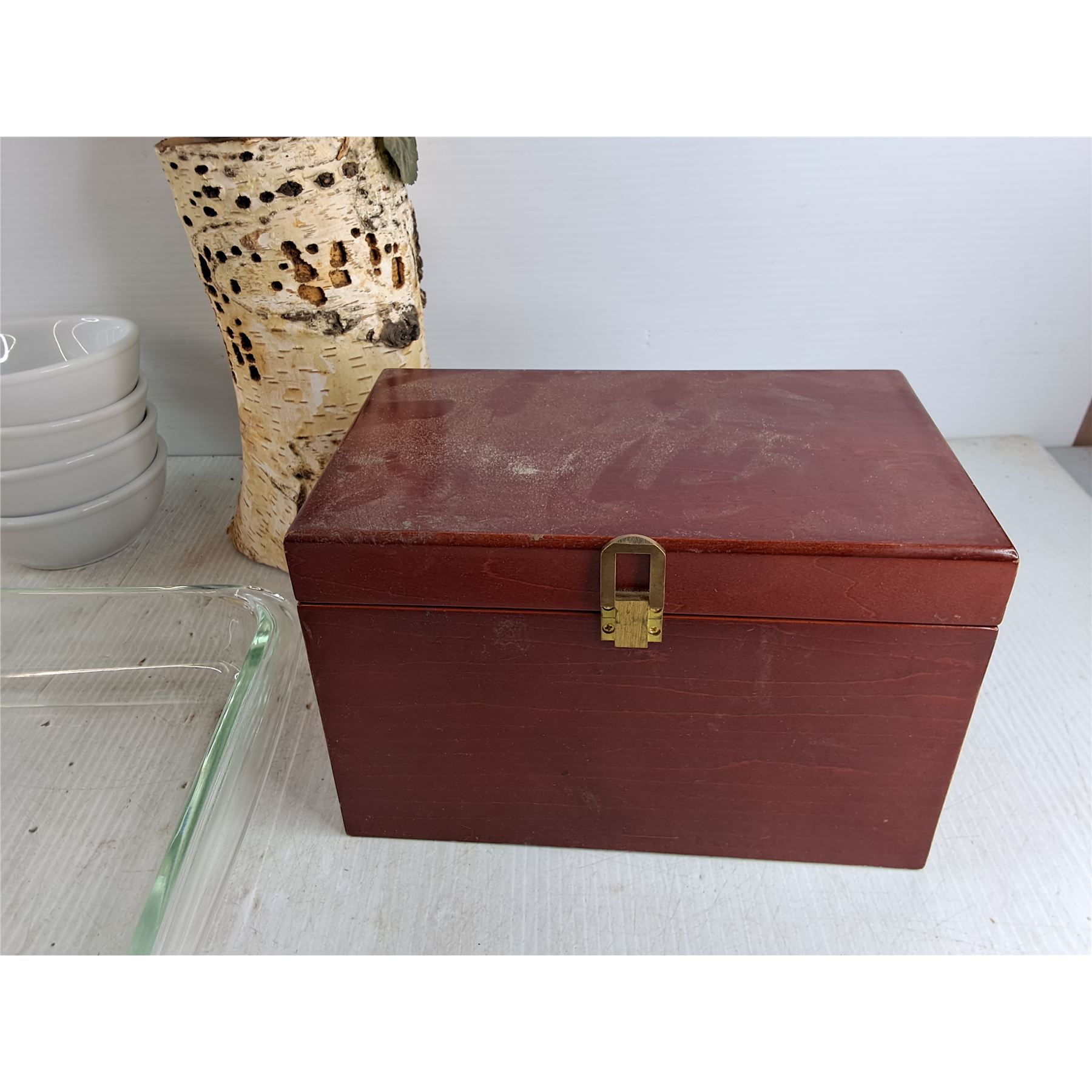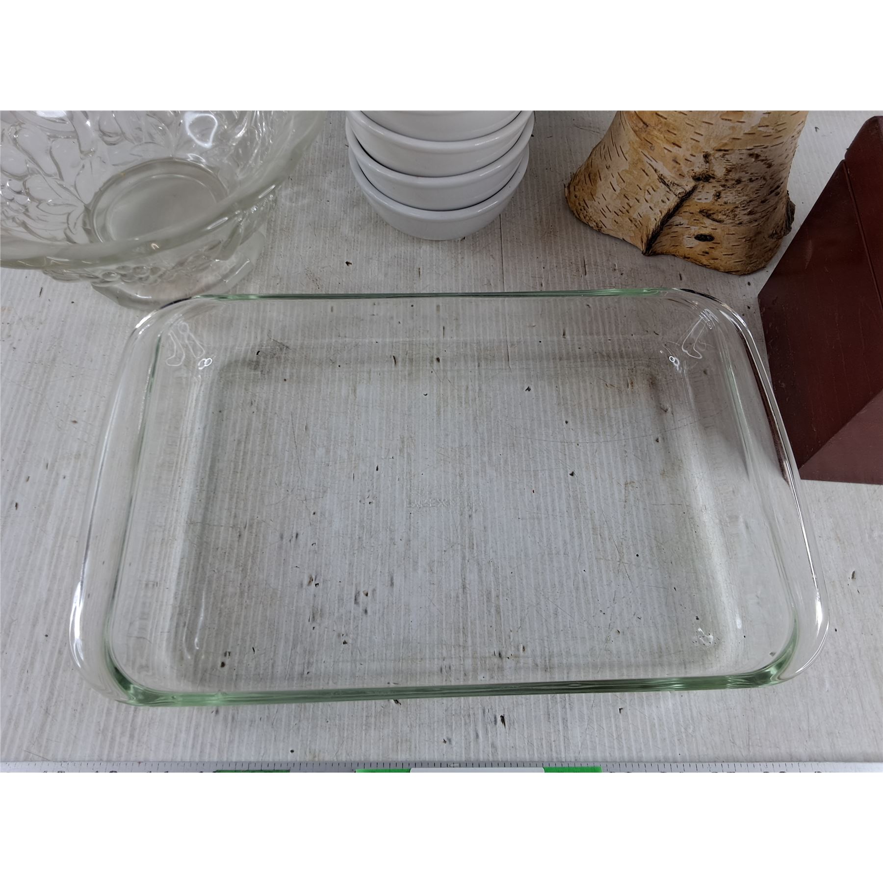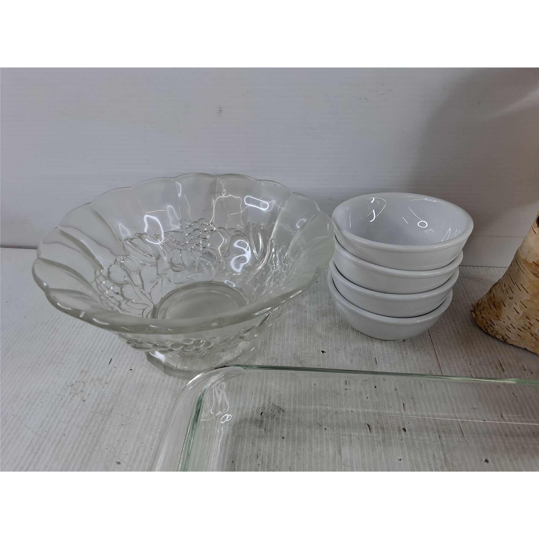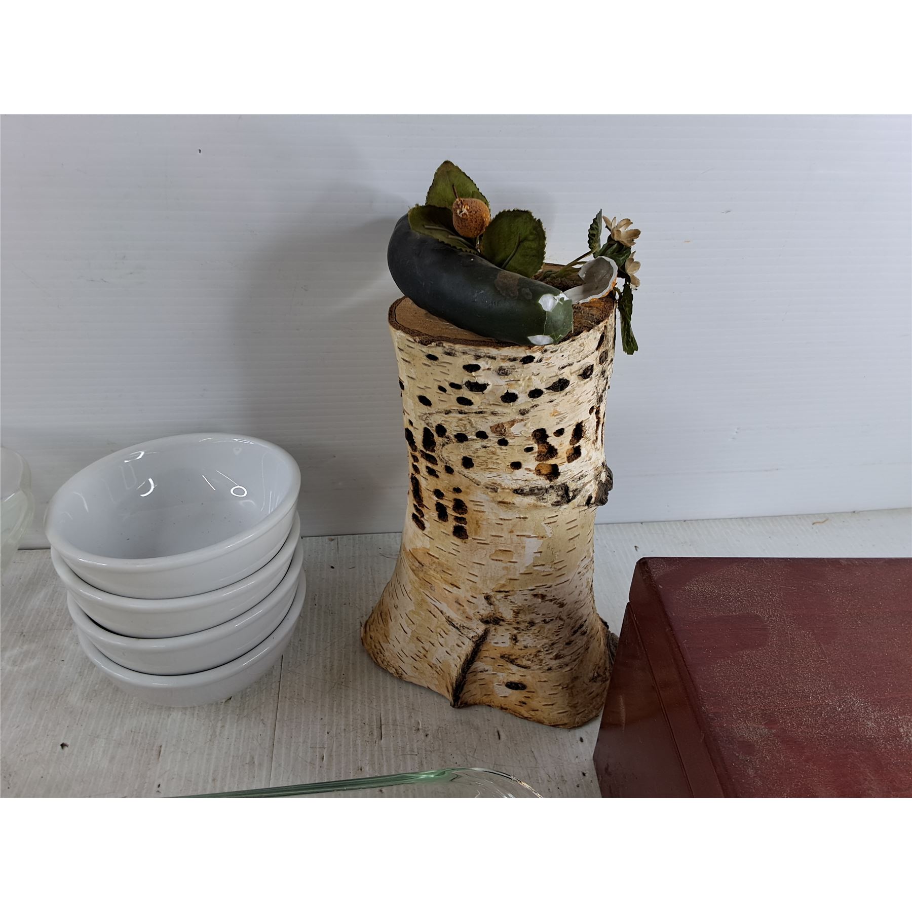 Glass Fruit Bowl, 5" Ceramic Bowls, Glass Baking Tray, Wooden Box 9" x 5" x 6", Wood Log Decor