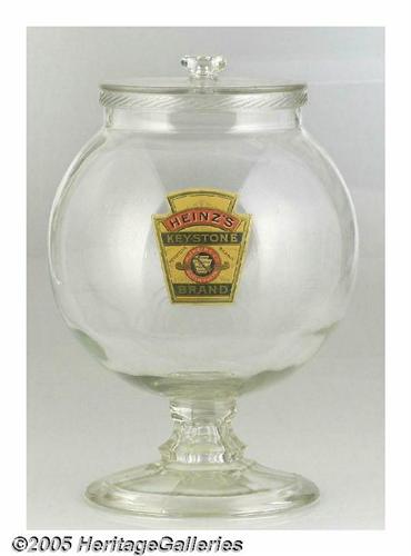 <B>Glass Heinz Label Show Jar</B></I> Possibly made by the Pittsburgh glass company as they were noted for this type of "fishbowl" shaped jar. Standing 14" tall, this jar sports the Heinz's Keystone Brand label. Most of these jars were used in the local general store to hold and sell pickles, horseradish, or other items for sale by the pound or piece. The jar has no chips or problems with the lid fitting loosely but certainly matching. Great size and condition for this jar. Lot:252