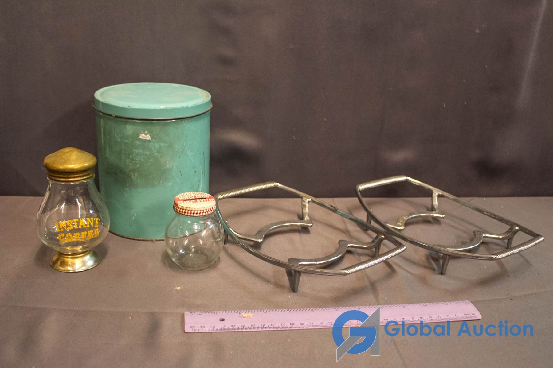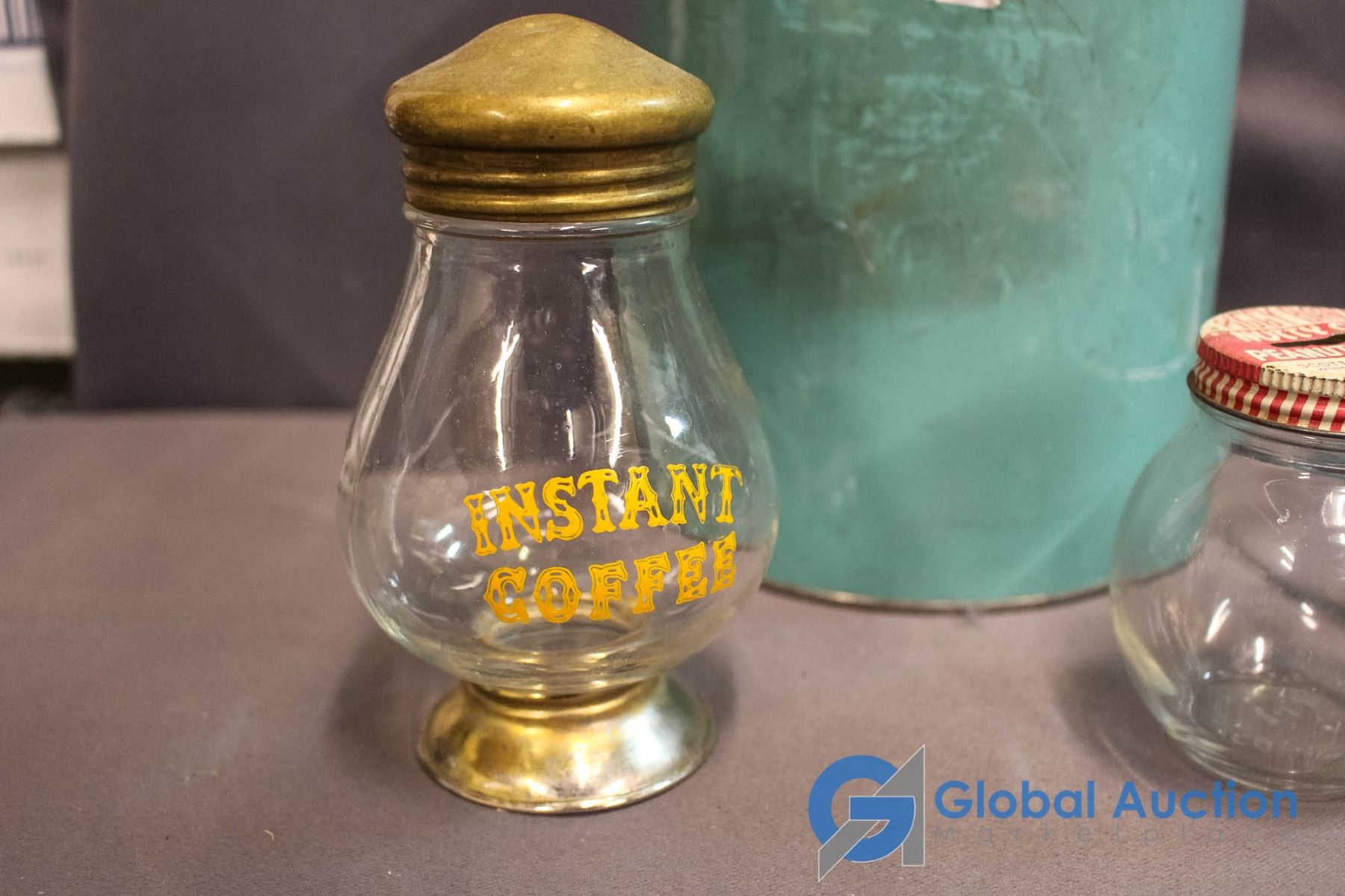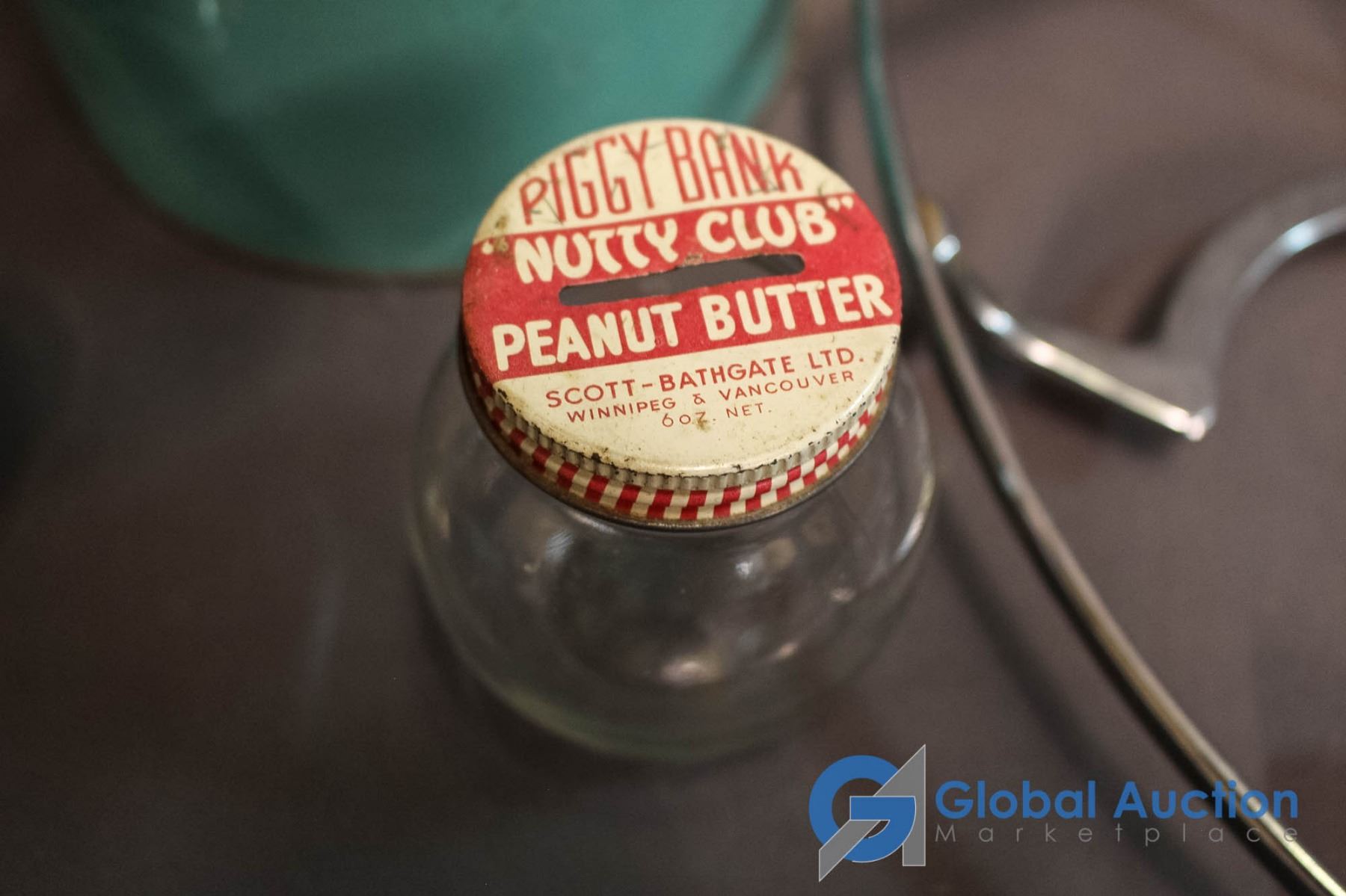 Glass Instant Coffee Jar; Glass "Nutty" Club Peanut Butter Piggy Bank, Canister, etc