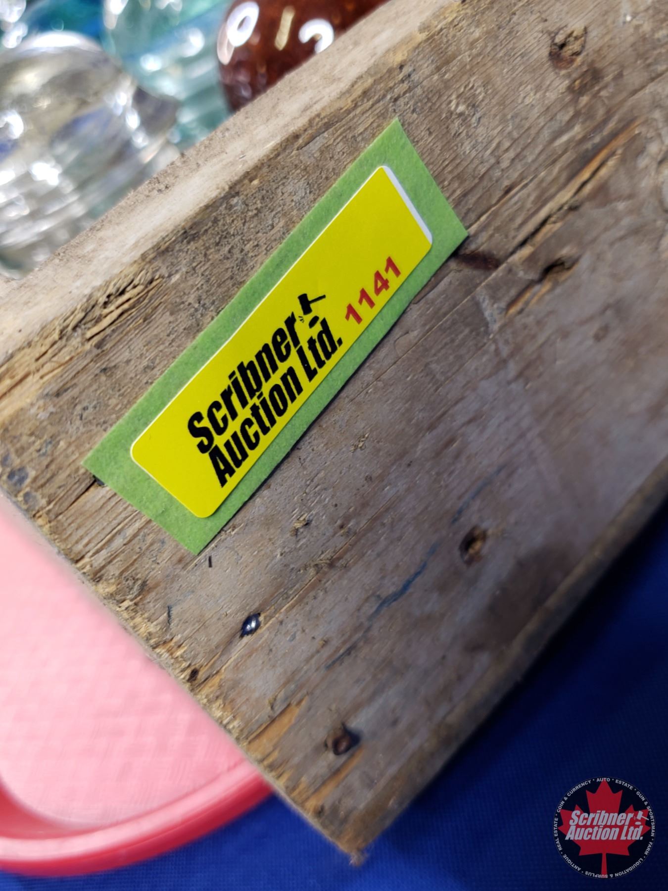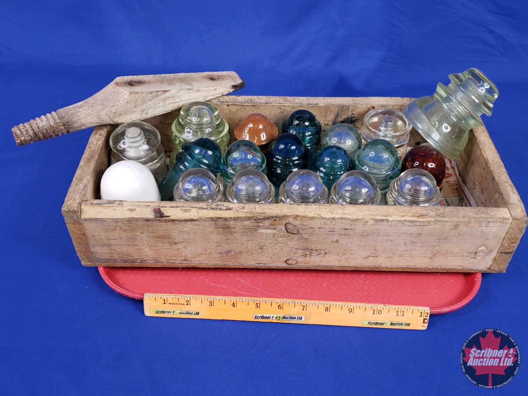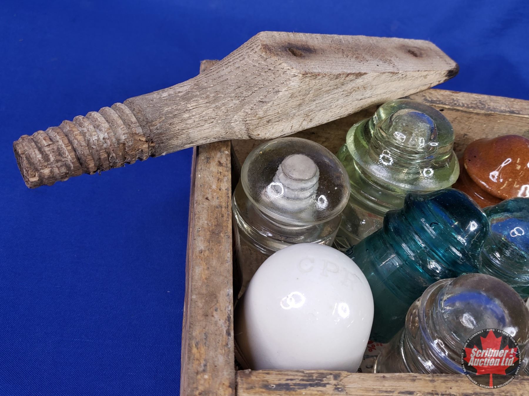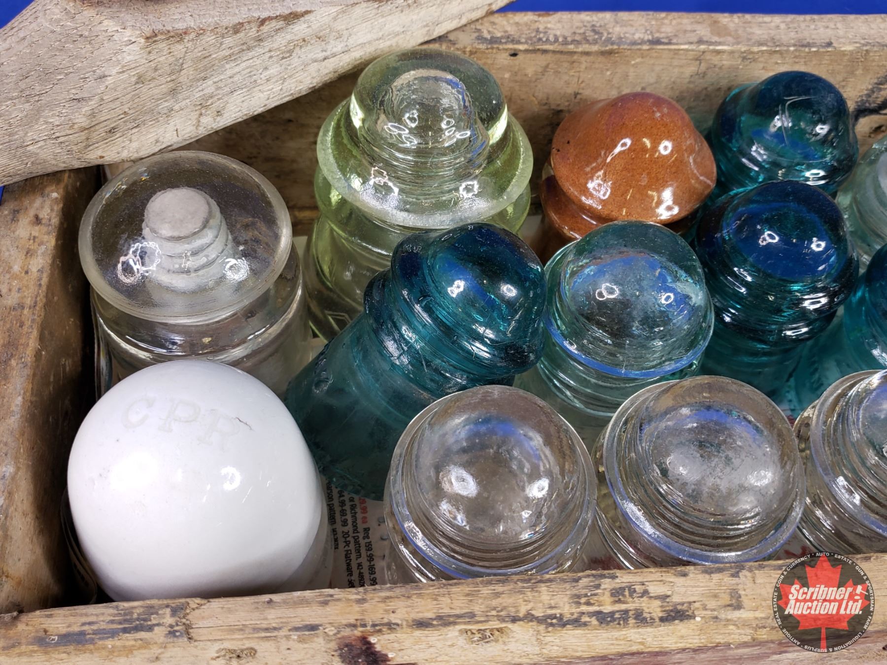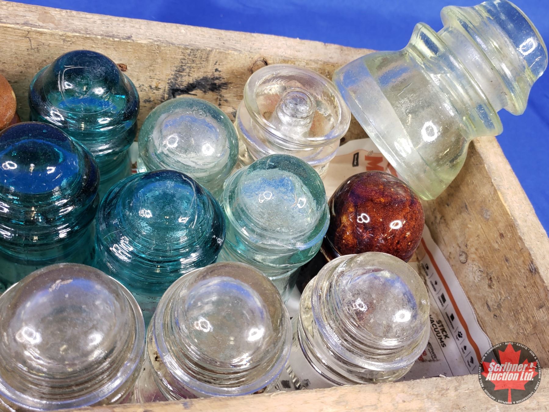 Glass Insulator Collection in Wood Box Tray (19 Insulators) (Box Measures: 3-1/2"H x 19-1/2"W x 9"D) (SEE PICS!)
