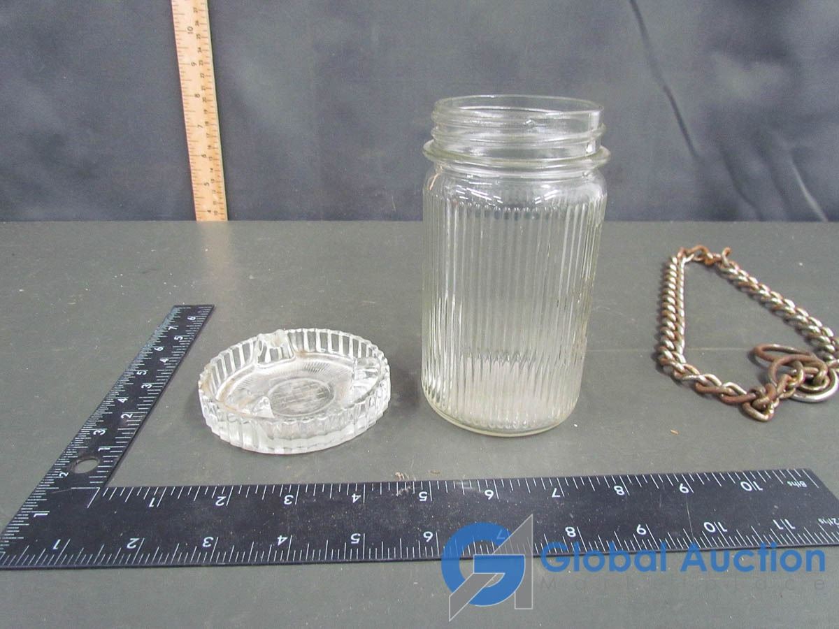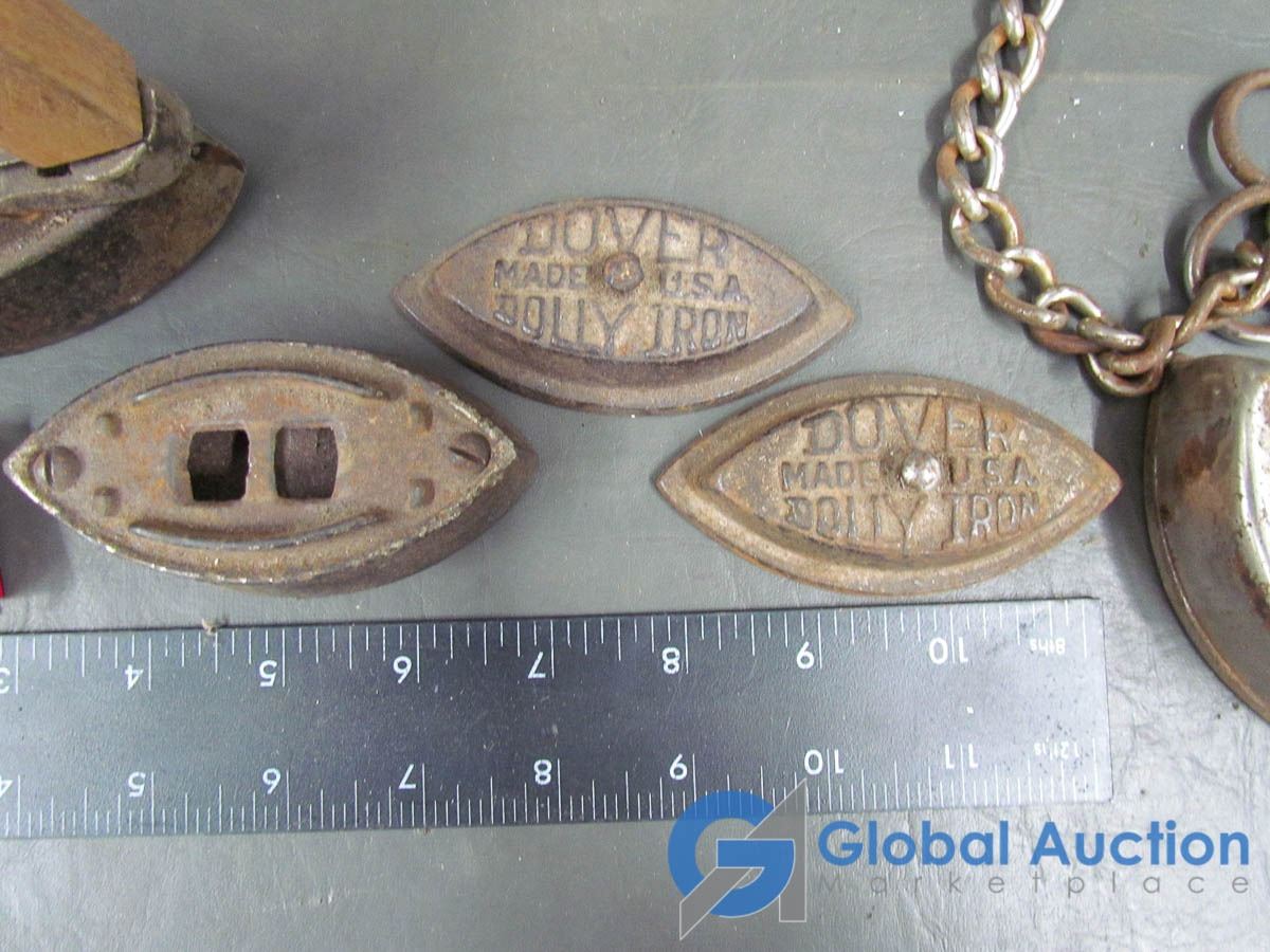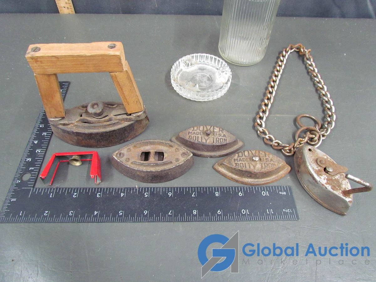 Glass Jar and Ashtray, Dover Dolly Irons, etc
