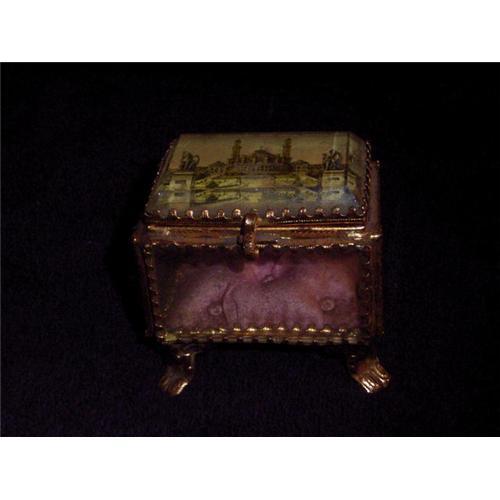 Goldplated copper jewel box with beveled glass, with a photograph of Paris under the glass of the cover,inlaid with mother of pearl.