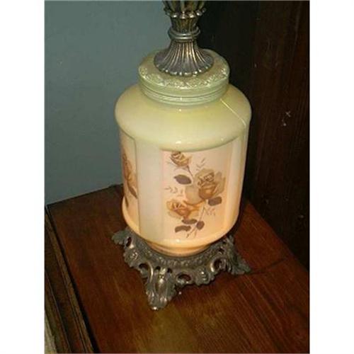 Table lamp in glass with Shabby Chic Yellow Roses, gorgeous lamp with 3 way switch. Lights in the bottom only, top only, or both top and bottom. Beautiful glass with beautiful roses on the base. The height measurement is to the top of the harp and the width measurement is at the base of the lamp. I purchased this lamp from the original owner who received it as a gift when she married over 50 years ago. Works great, has no chips or cracks. The picture was taken with the lower light burning.