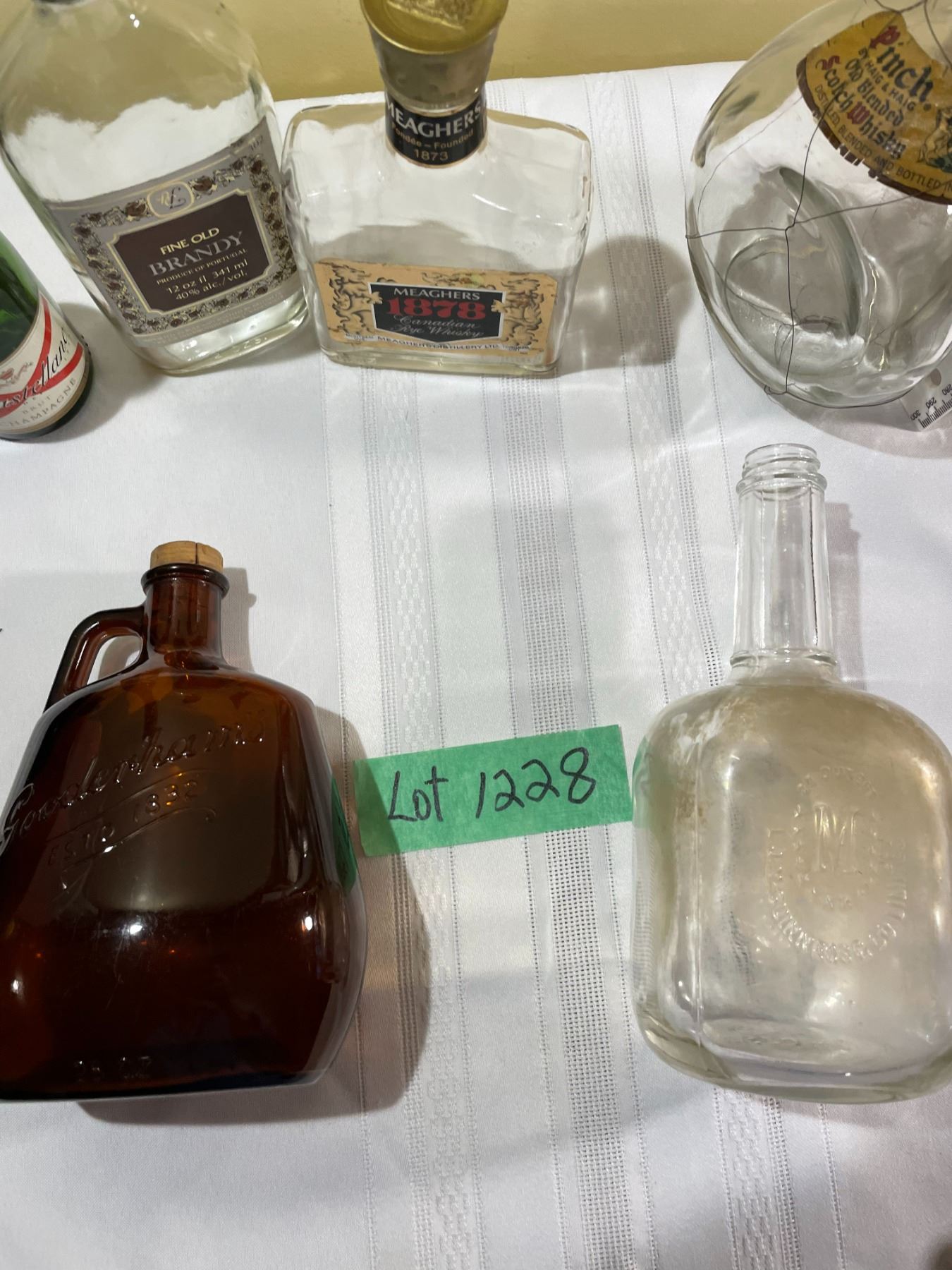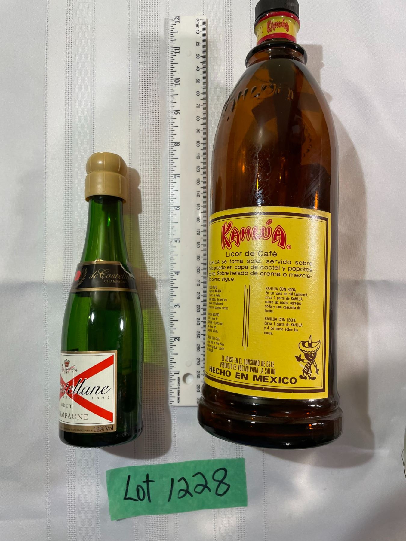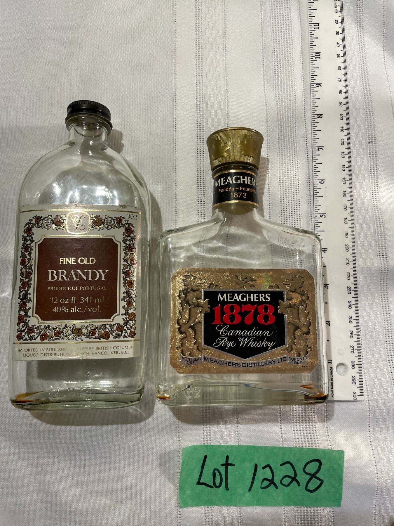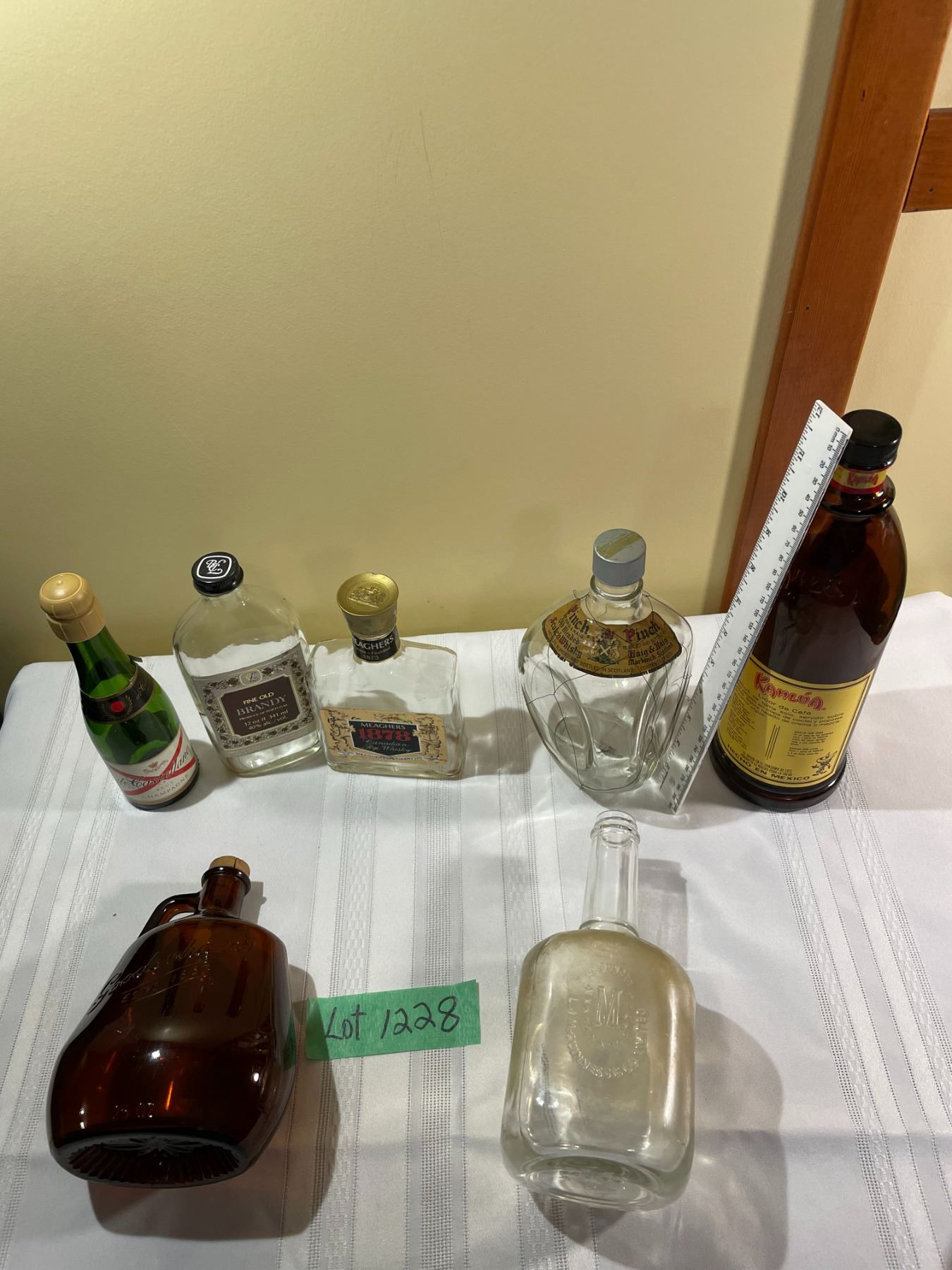 (1) Kahlua - Mexico - 1000mL (1) Gooderham's - estd 1832 - 25 oz Cork cap (1) Bottle With wire Pinch Old Blended Scotch Whiskey by Haig + Haig - Scotland (1) Square McGuiness Bottle - L.J. Mc. Guiness Co. Limited 25 oz. (1) Champagne de Castlellane 200mL (1) Meaghers 1878 Canadian Rye Whiskey Meaghers Distellery Ltd. Montreal- Toronto (1) Fine old Brandy - Product of Portugal 12 fl. oz, 341 mL- Imported + bottled in British Columbia