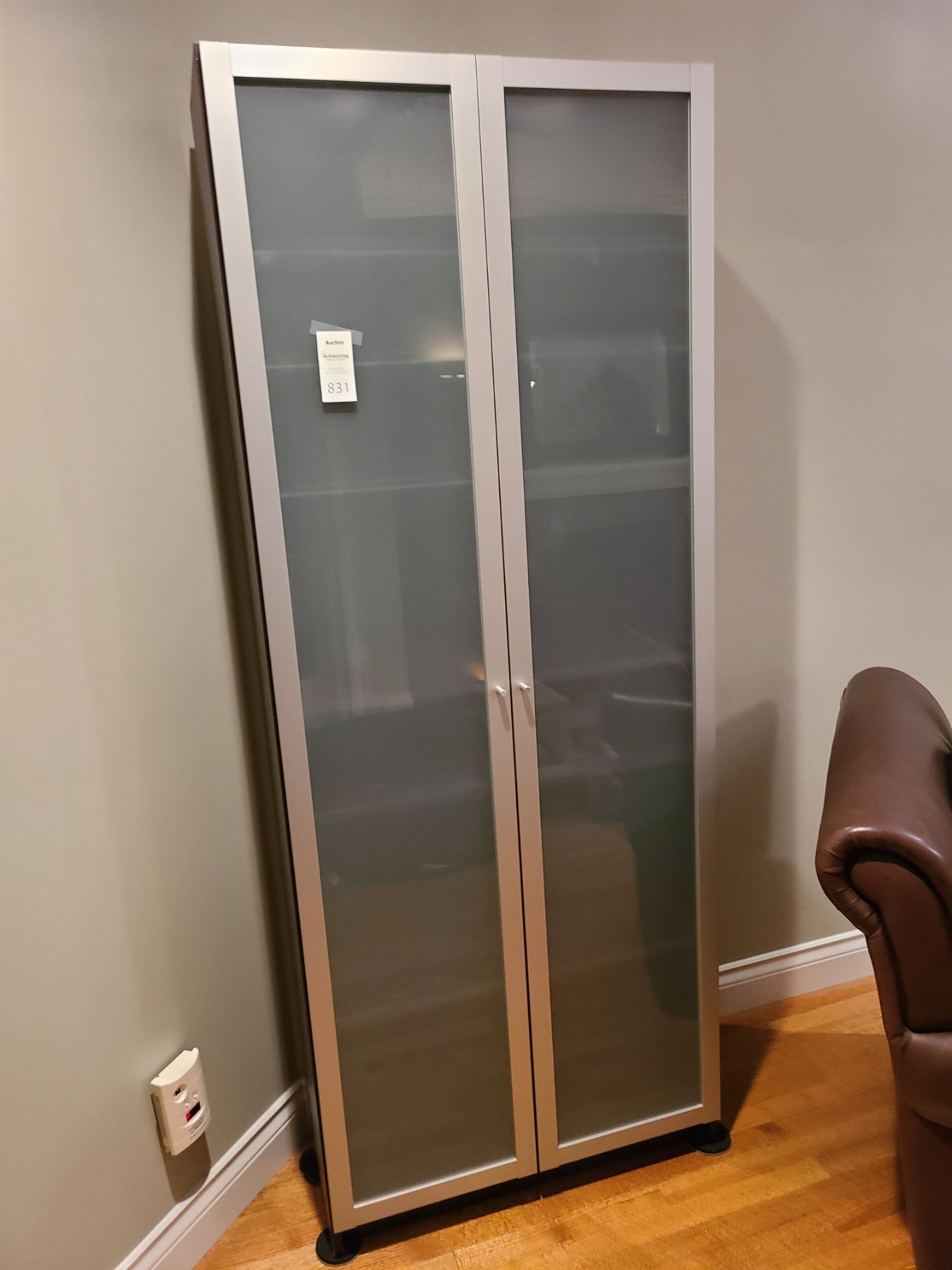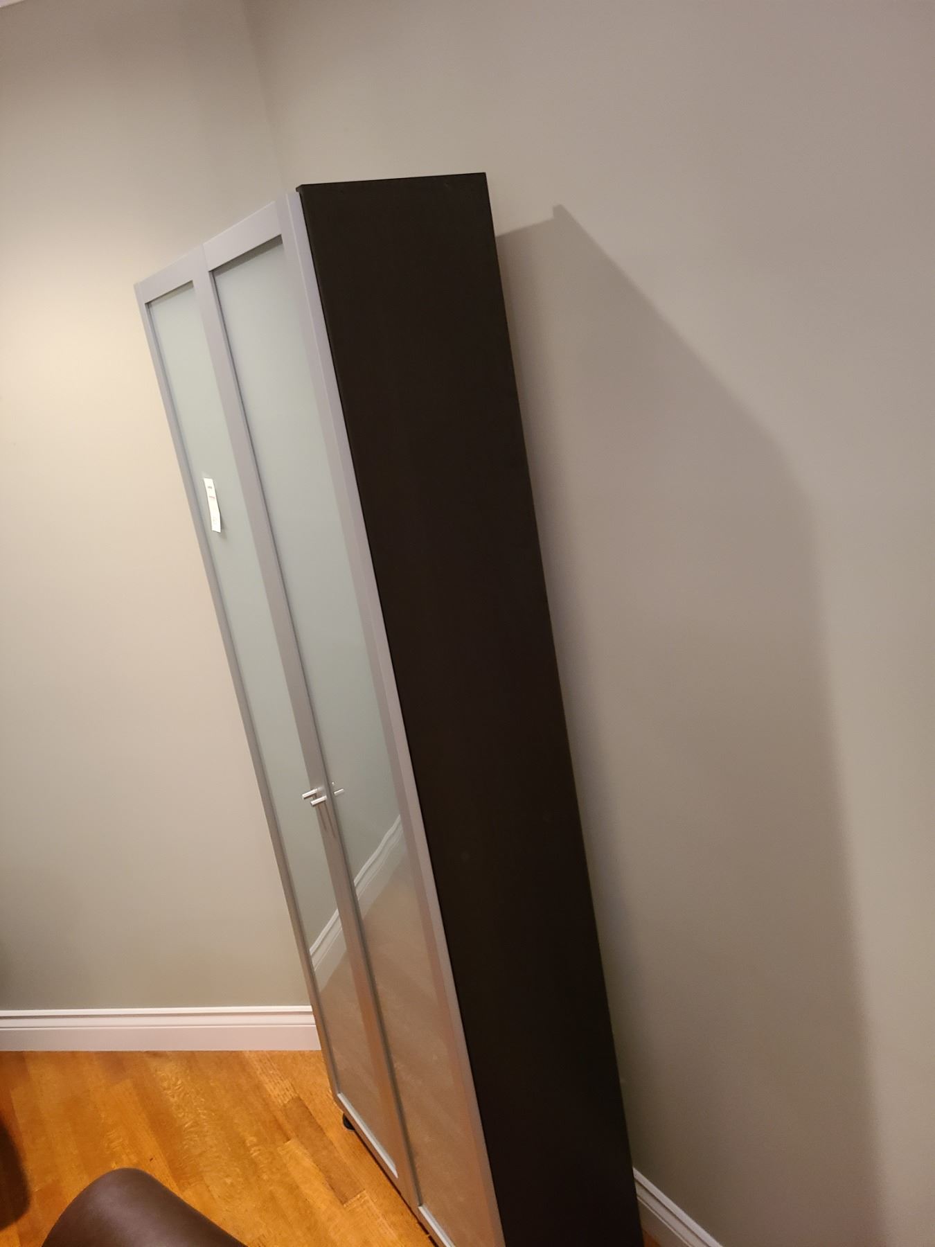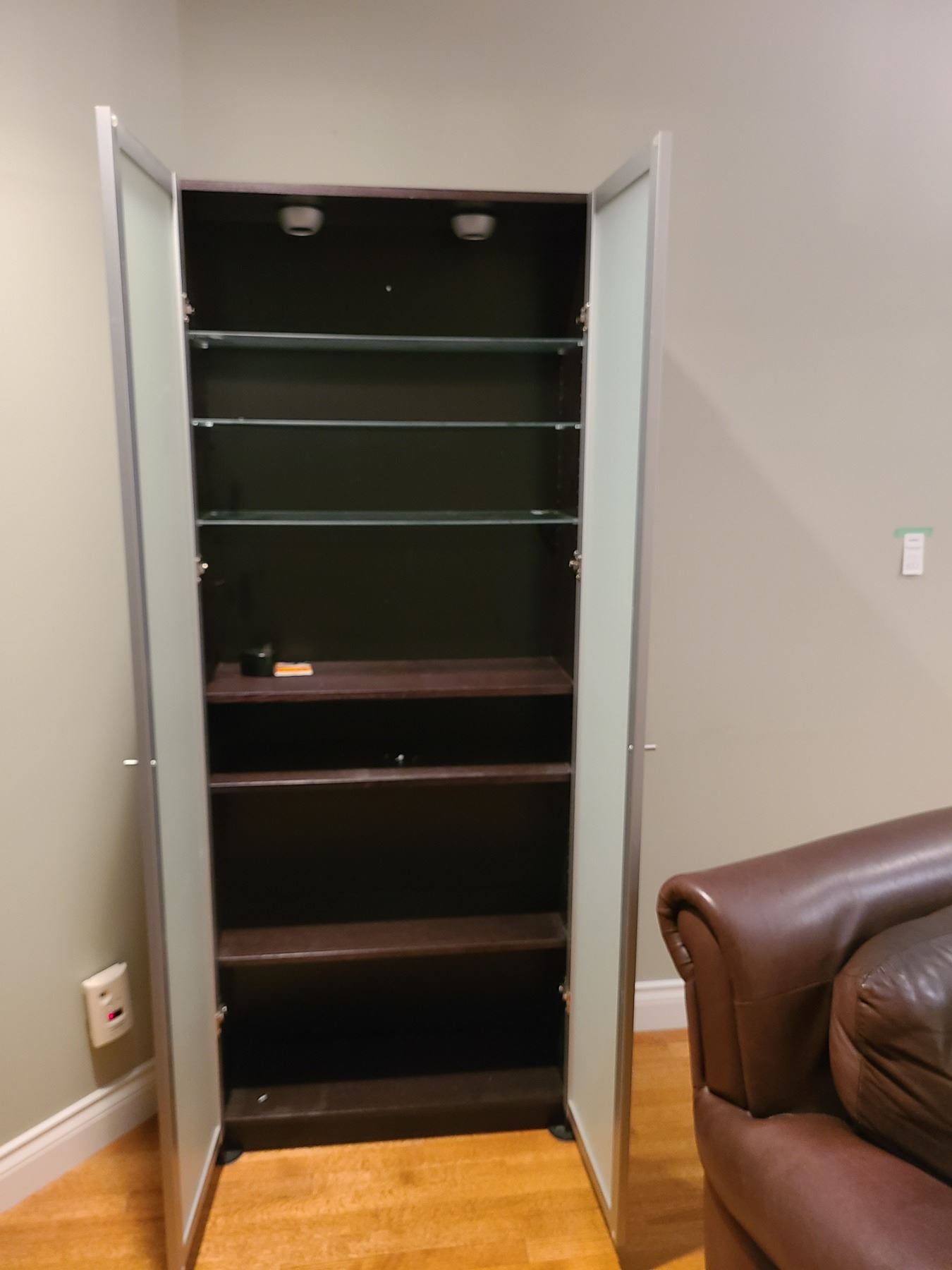 Cabinet 32X12X80 glass & wood shelves. Bring help to move and pick up at at 11 am
