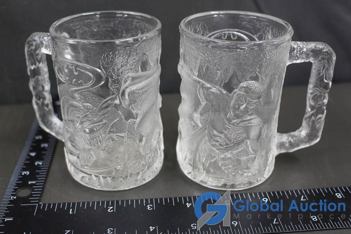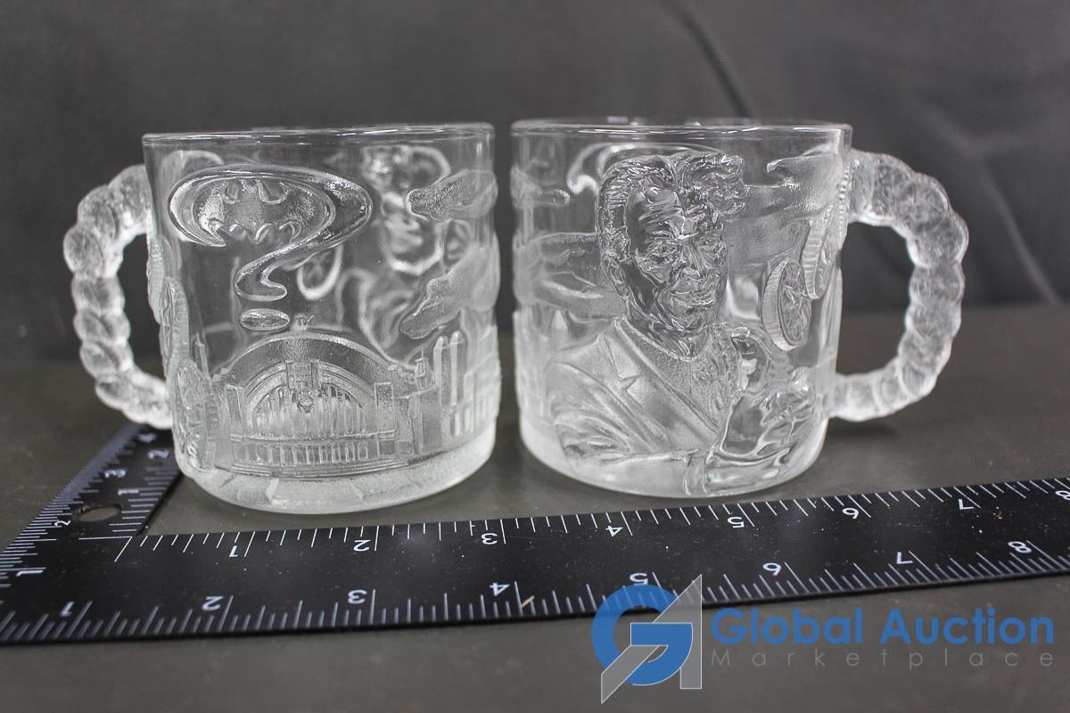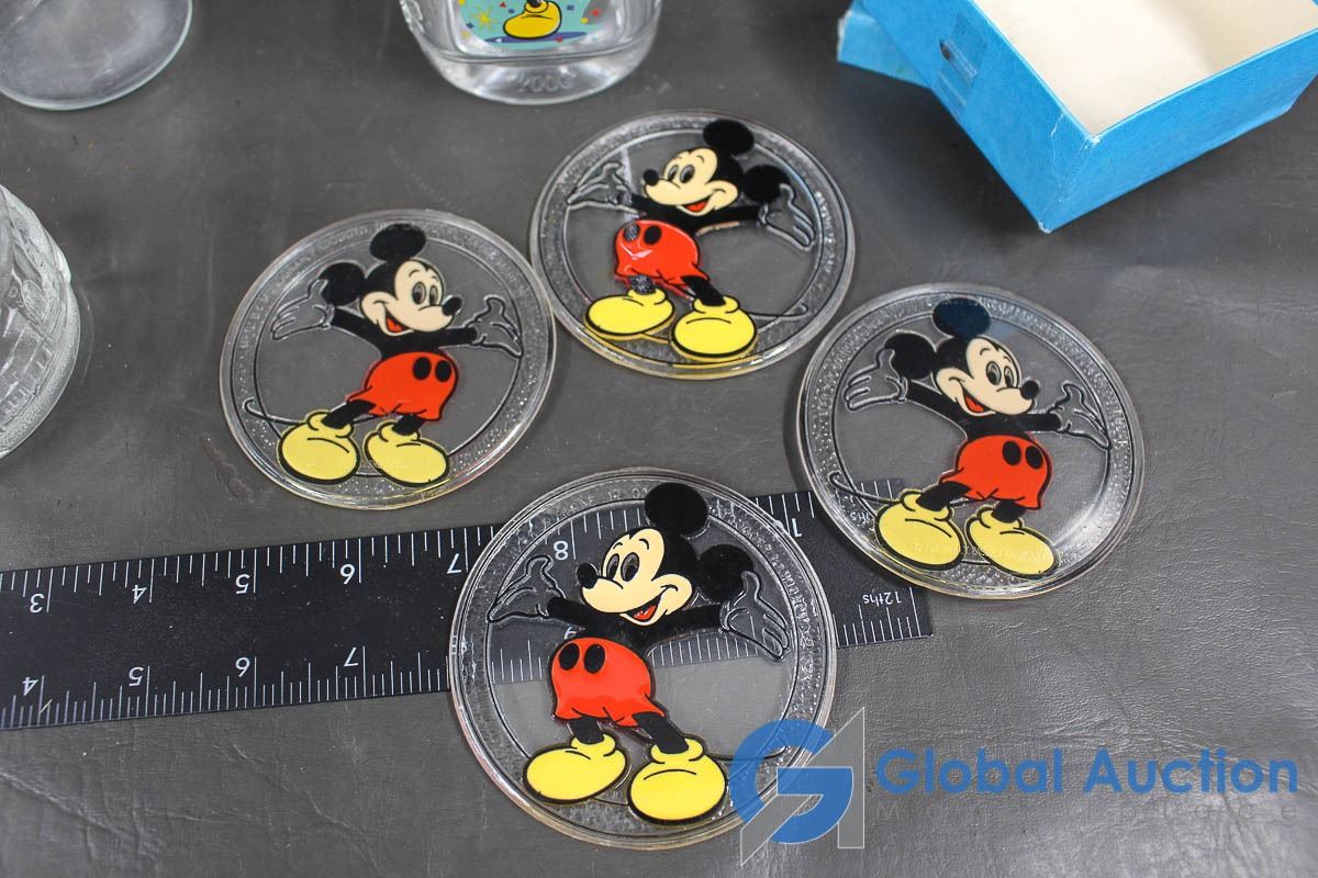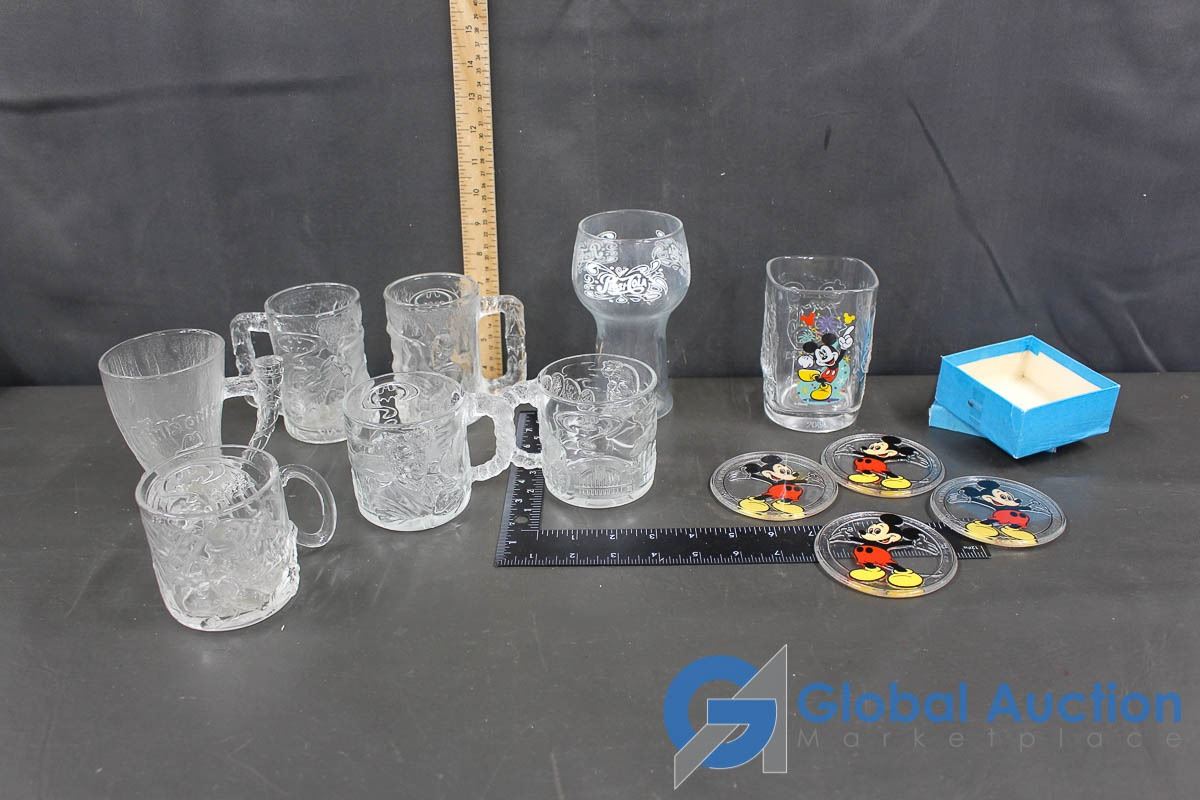 Glass Mugs (Mickey Mouse, Flintstones, Batman Forever, Pepsi-Cola) & Mickey Mouse Coasters