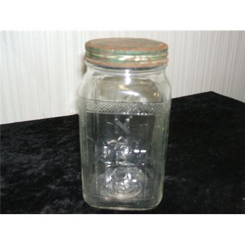 Square Glass Nabob Coffee Jar with original Lid. Side of Jar reads Nabob Brand Made in Canada Kelly Douglas Co. Limited. Lid reads Nabob Brand Food Products. Significant amount of rust on lid. Glass in excellent condition.