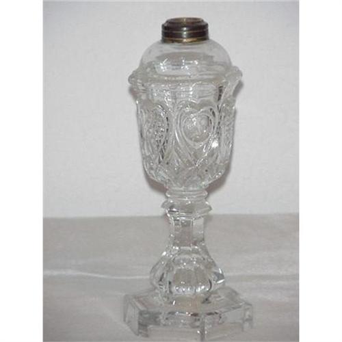 A lovely antique Flint glass oil lamp, 9 1/4" tall, 4" diameter base. The font is decorated with hearts and sits on a six sided pedestal base. The original burner is gone and the base has been fitted with and electric lamp that screw into the font. Condition is very good, although there is a tiny chip on the inside bottom of the base. The lamp is lovely and will make a great addition to any oil lamp collection.