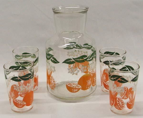Glass Orange Juice Set, 1 Carafe and 4 juice glasses, carafe measures 7.5''H x 4.25''diameter. Buyers Pay Actual Shipping and Handling Charges(see terms and conditions for more information).