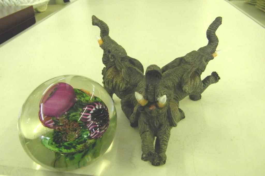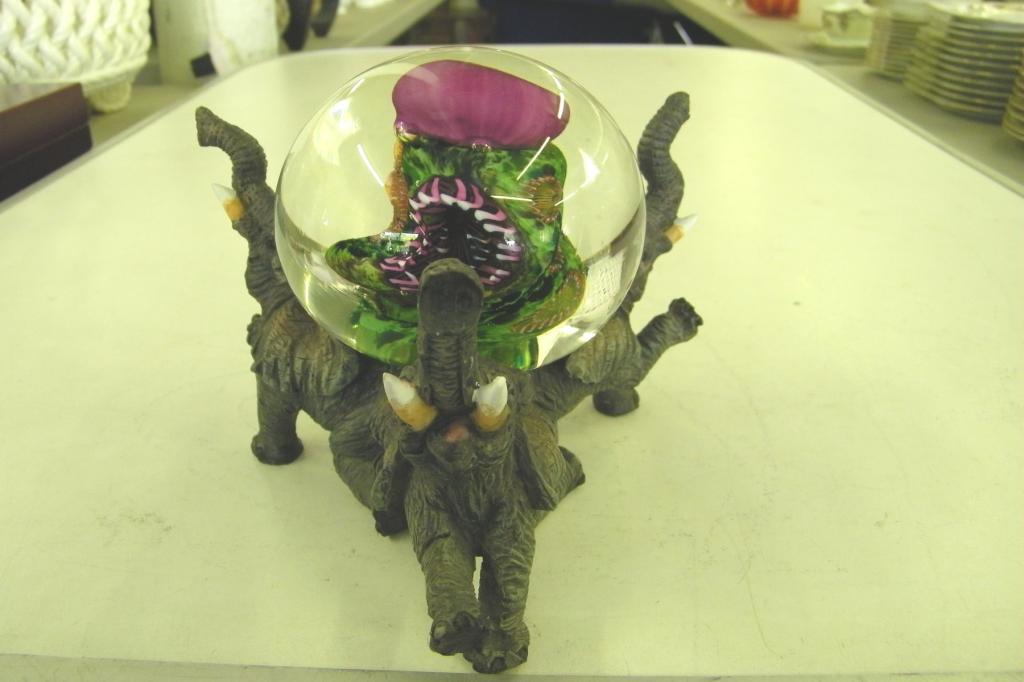 Glass Paperweight w/Triple Elephant Stand -