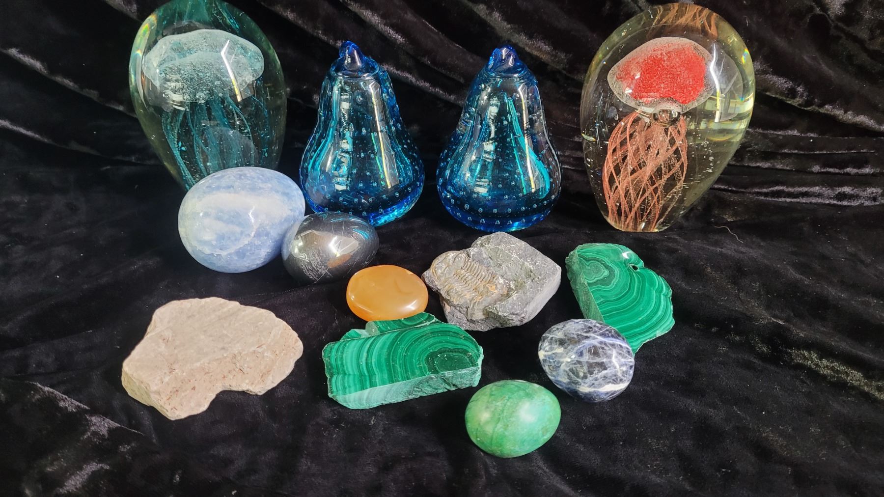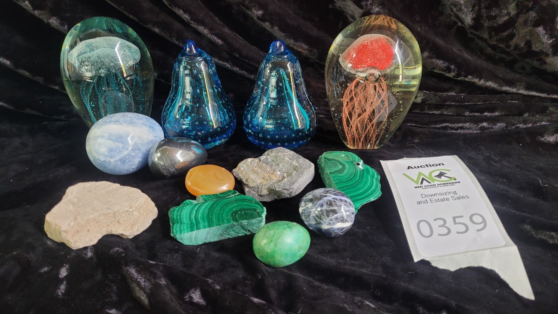 Assortment of glass paperweights and stones. Pickup at 9 am