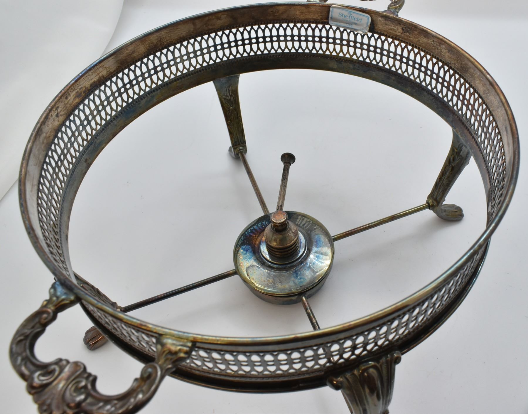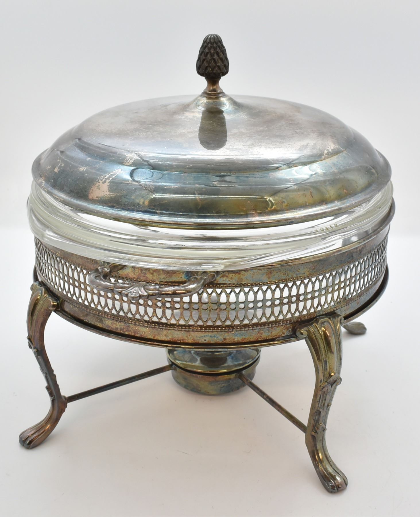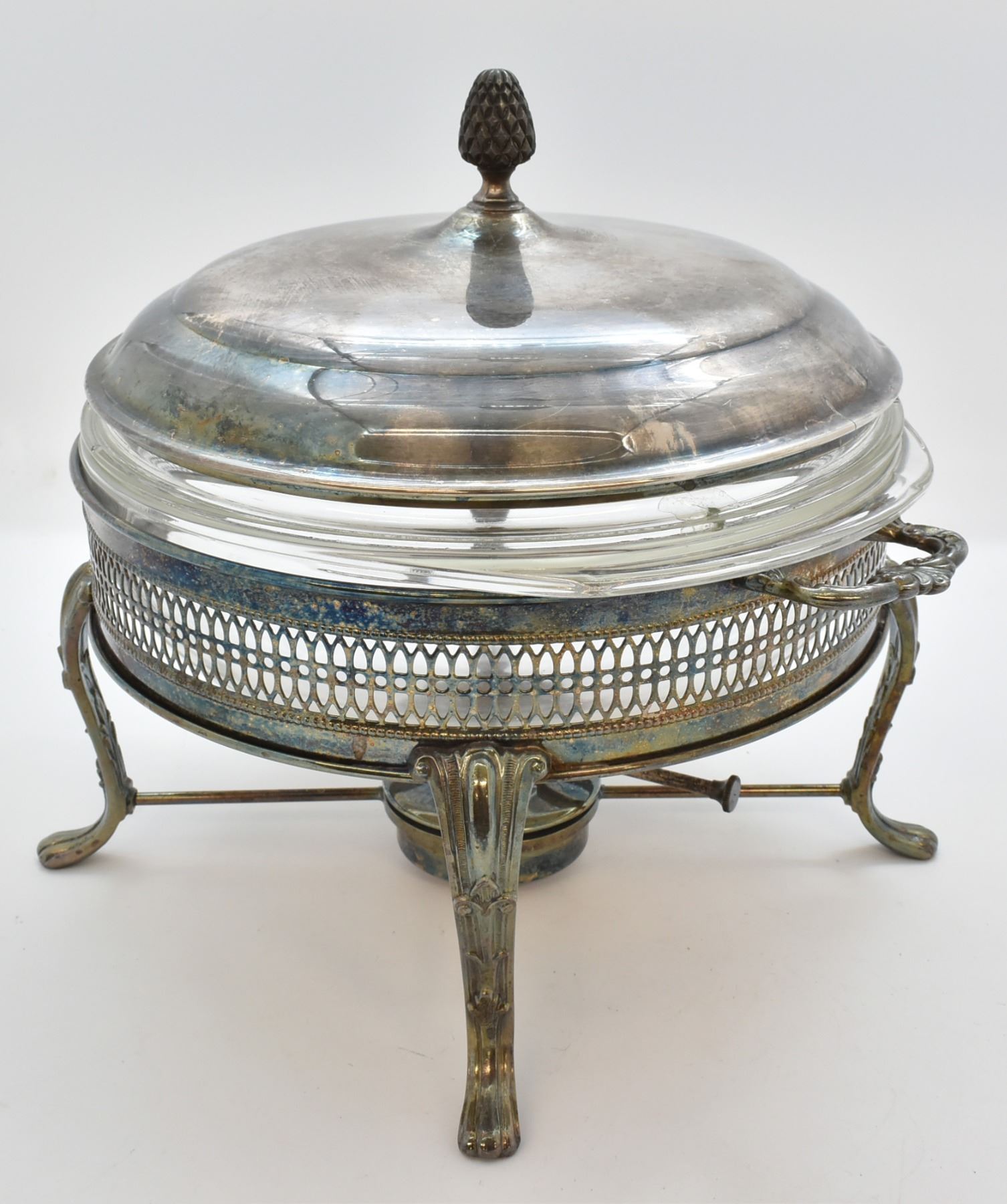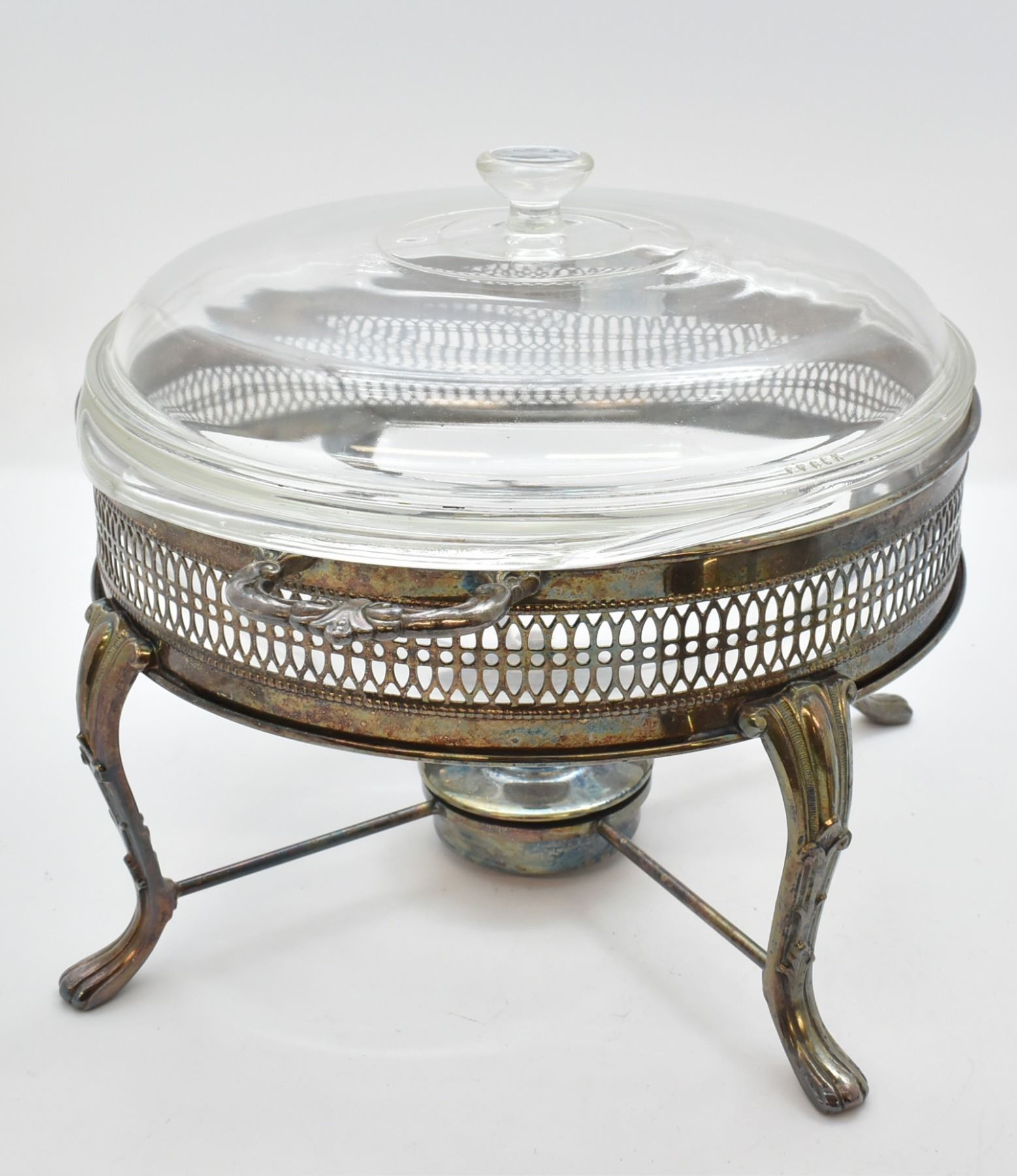 Glass Pirex Chafing Dish with Silver Plate Cover and Stand. This piece measures 11'' x 11''