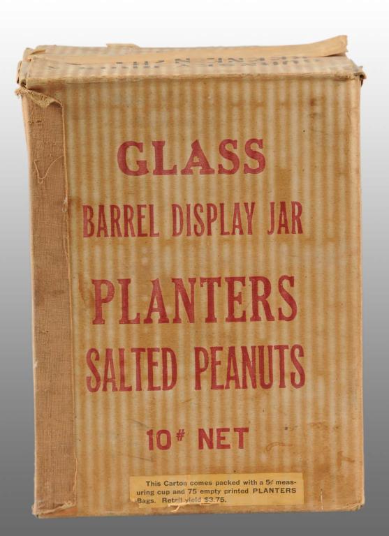 1930s. Display jar and lid have no chips or cracks with rectangular label on jar in perfect condition. Includes original shipping box and the running Mr. Peanuts contain some silver overlay paint. Condition (Near Mint). Size 12" x 8".