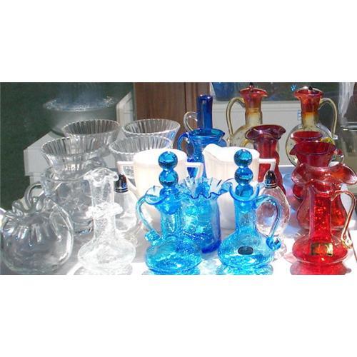 IMAGE 1:BEGIN W/BACK L, MOVE FROM L TO R, MOVE UP 1 ROW AT A TIME, TO ID EA OF THESE ITEMS. #1,2,6,7: 4 Stars & Stripes Anchor Hocking, Limited Ed Sherbets, 1942 only, during WWII. Crystal glass, 3.5? H, 3.75? Dia at top. Set of 4: 2 Excellent Condition; 1 has flea bite unseen but felt in base; 1 has very small chip in base. Sold for 5 Cents ea in ?42. Now value $14 ea, per Collectible Glassware from the 40's, 50's, 60's, An Illustrated Value Guide, 8th Ed, 2006, by Gene and Cathy Florence, page 235. #3: Early WV, Mouth-Blown Crackle Glass w/Blenko-like Rough Pontil. I believe made 40?s-70?s. Magnificent Very Intense Cobalt Blue with clear-glass pulled-back handle. 5.25? H and 2.75? W, including handle. Seed Bubbles within the glass which can be felt on the outside of the glass, and a 0.5? scratch on lower side of jug, which I believe could be polished out by an expert. I am not sure re value, as the value of cobalt blue has gone up in the last year. Even with the minor scratch, I think it might bring $35. #4 & 5: 2 Eagle & Stars Syrups, Special Ed of Kanawha #830, with 3-Mold Pressed construction, in Ruby, Amberina, and Amber, with pulled-back amber handle, with cork/silver-tone metal stoppers. Both sides of both pieces have an Eagle surrounded by Stars pressed into the glass. This set would really go well in your display for July 4th. I believe these were made 1955?1989 (possibly made in 1976 for U.S. Bicentennial). The one on the L is 6.25? H, and in Excellent Condition. ...