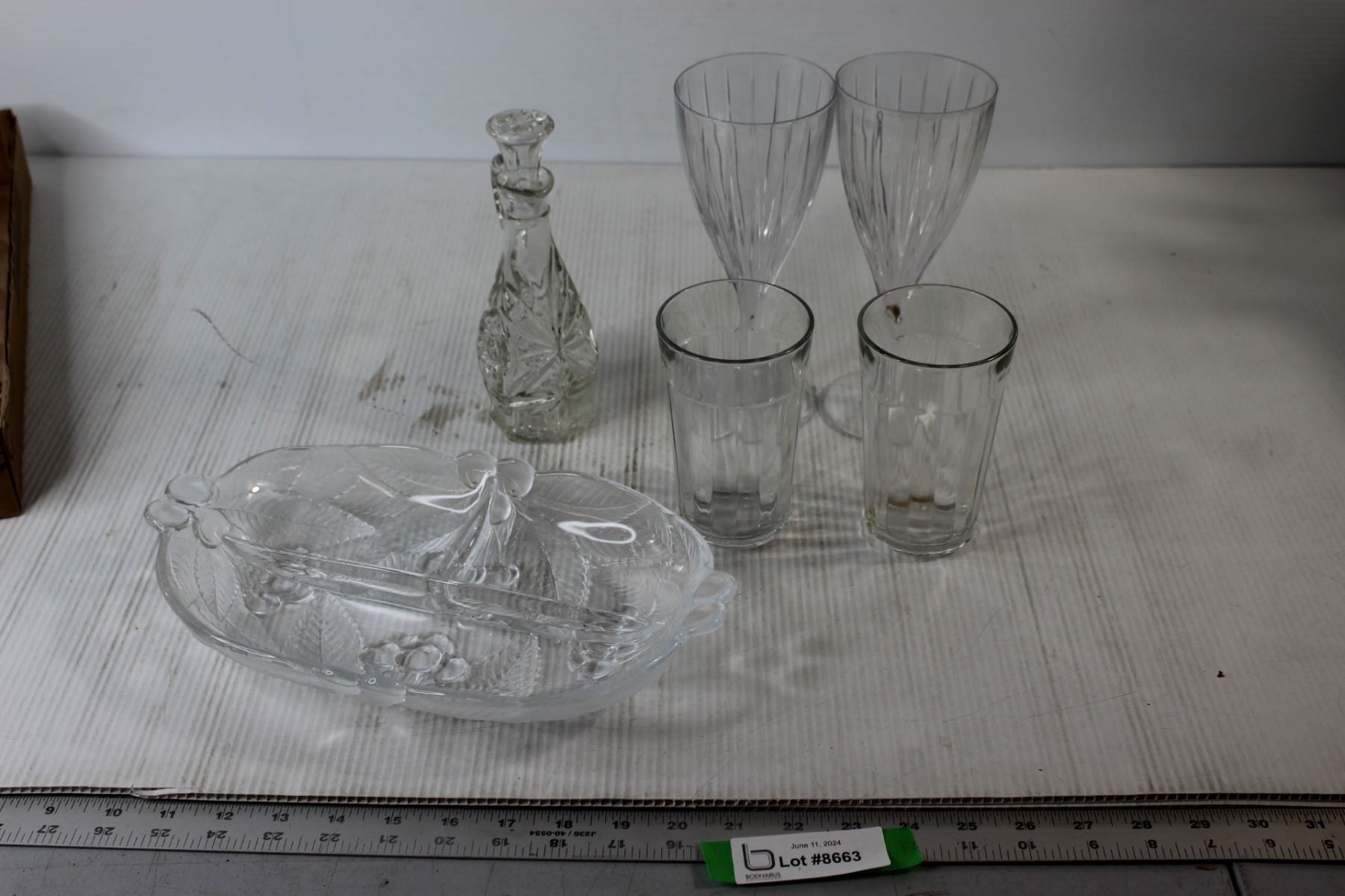 Glass Serving Tray, (2) Plastic Wine Cups, (2) Drinking Glasses, Decanter