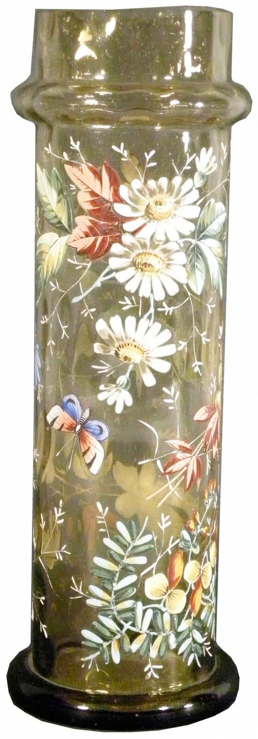 Glass Straw Holder.Antique Sage glass with enameled floral décor. A 4" crack in back center, does not detract from piece otherwise excellent condition. 11 1/2 inches tall.