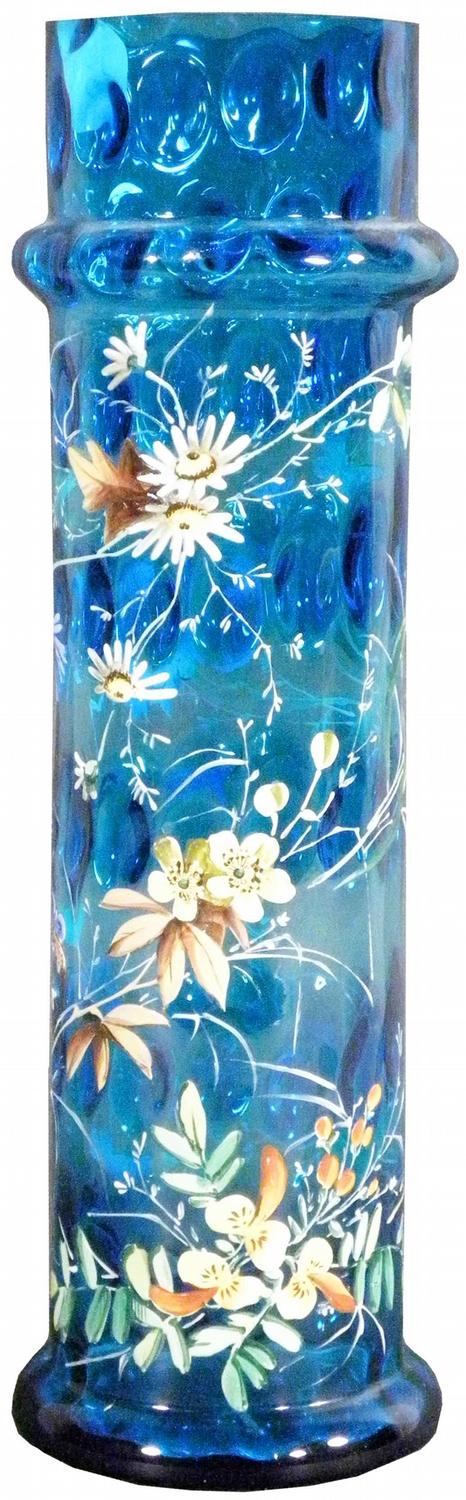 Glass Straw Holder. Blue thumb print with floral enamel décor. Tiny chips on the top rim otherwise very good condition. 12 1/2 inches tall.