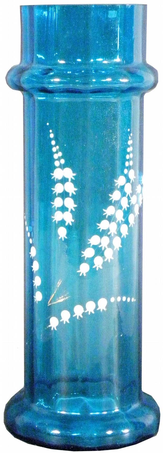 Glass Straw Holder. Blue glass column patterned glass with enameled lily of the valley décor. Very tiny chip top of rim otherwise excellent condition. 10 3/4 inches tall.