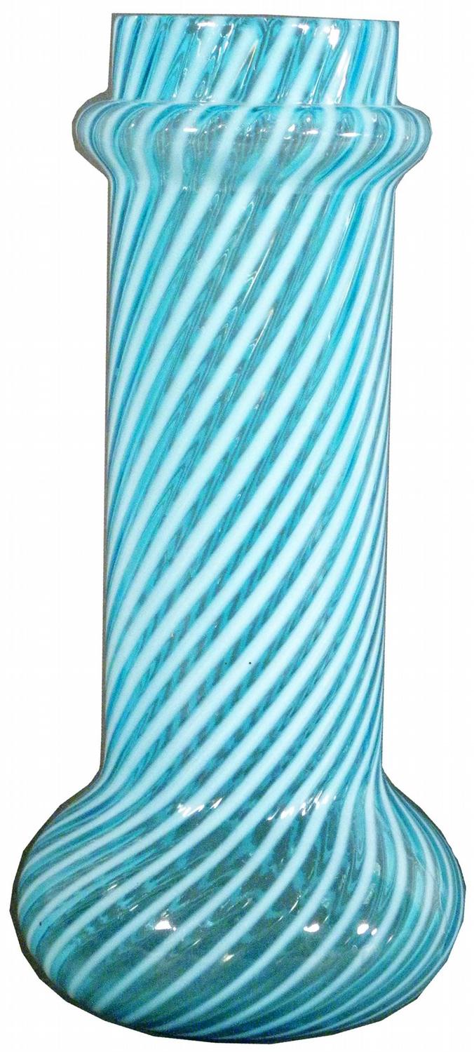 Glass Straw Holder. Aqua and milk glass swirl pattern. Slight chip on the lip otherwise condition. 10 inches tall.