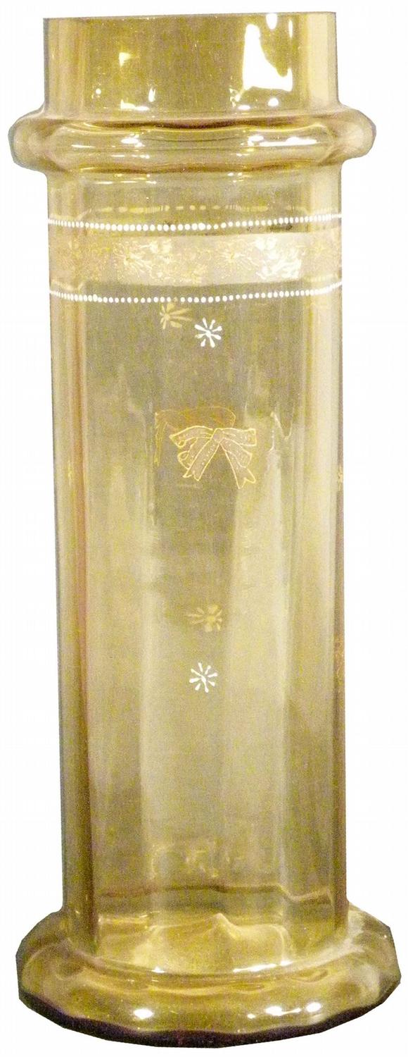 Glass Straw Holder. Amber glass with column side, enamel décor of bows and daisy's. No chips or cracks. Excellent condition. 10 1/4 inches tall.