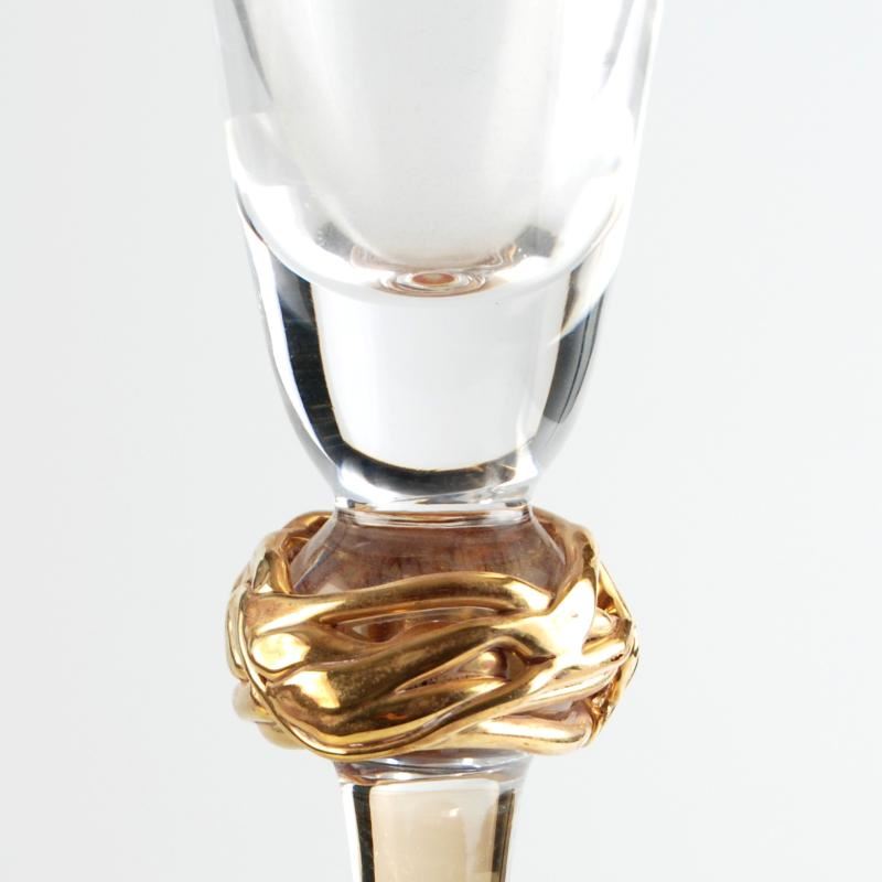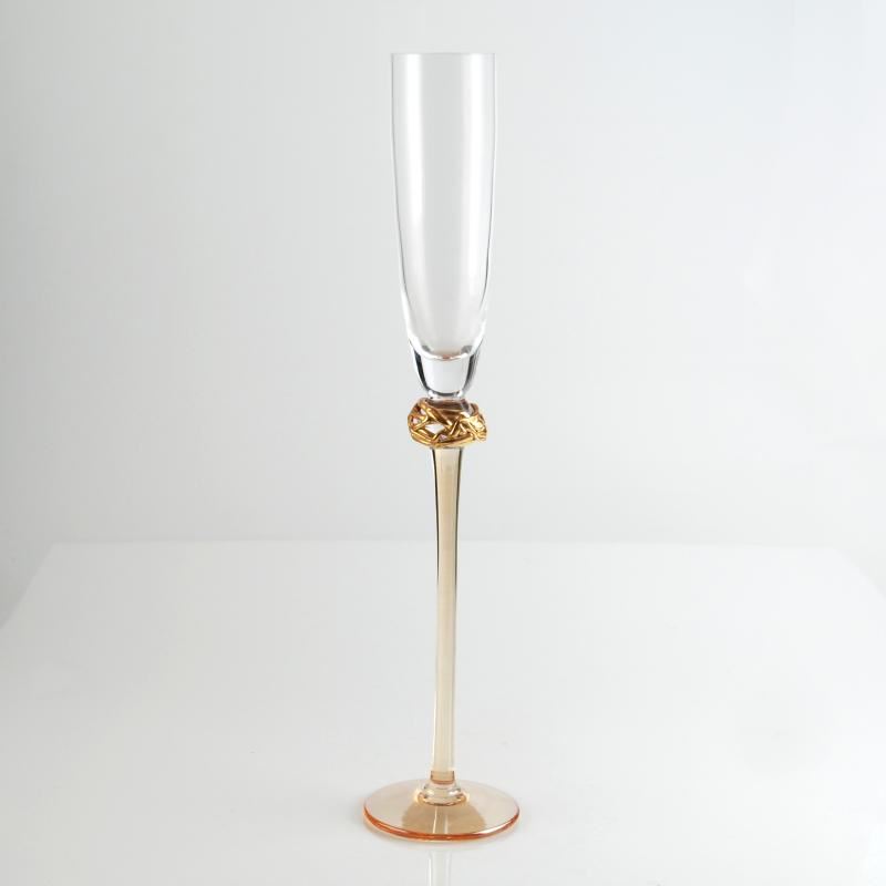 Ion Tamaian creates stunning glass pieces that are both elegant and functional. This is a hand blown glass champagne flute, hand signed by the artist! A Certificate of Authenticity does not accompany this piece. Measures approx. 2" (opening) x 15" (height), 3" (base).