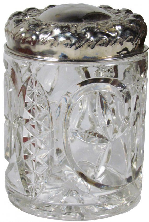 Glass Tobacco Humidor. High Relief silver plated lid with fancy leaded glass base. No chips or cracks. 5 1/2 X 4 inches.