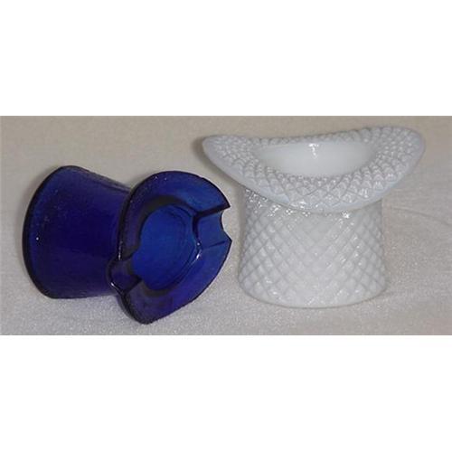 Two glass top hats, one a white opalescent milk glass, 2 1/2" tall, 3 3/4" wide. The other a cobolt blue ashtray, 2 1/4" tall, 3 1/8" wide.
