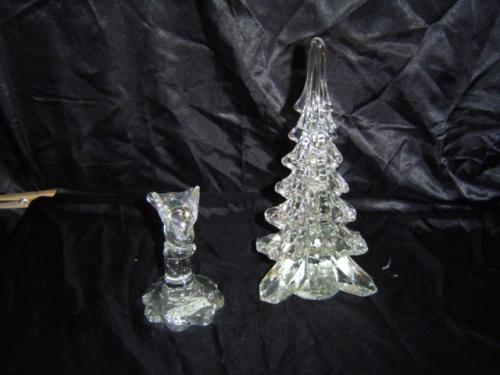 Two piece collection including: a 9.5"H X 4.5"W Glass Christmas Tree and a 4" clear opalescent bird on a pedestal