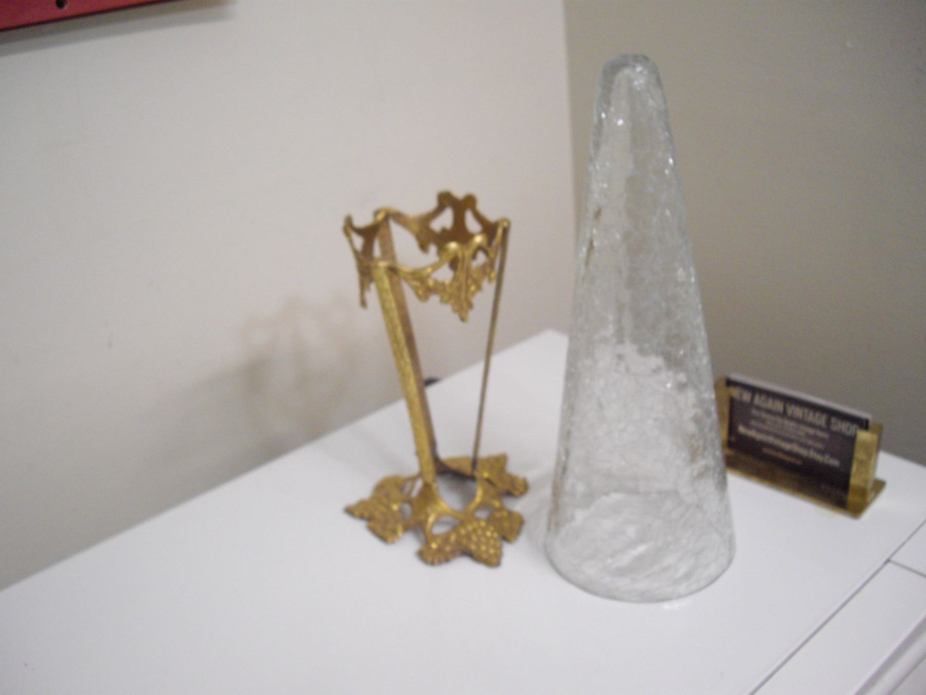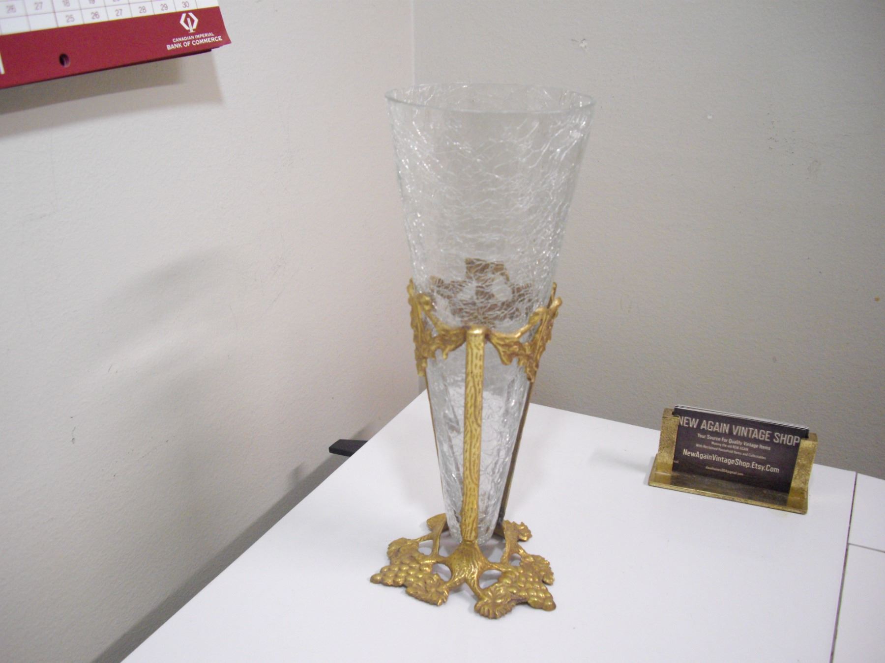 The glass vase including stand is 11 " tall. The cone shaped vase is in very good condition it has a cracked etched pattern. The top opening is 4 " wide narrowing to 1 ". The vase sits in a solid brass stand that is 7 " tall x 4 " wide bass, weight of both is approximately 1.14 pound.