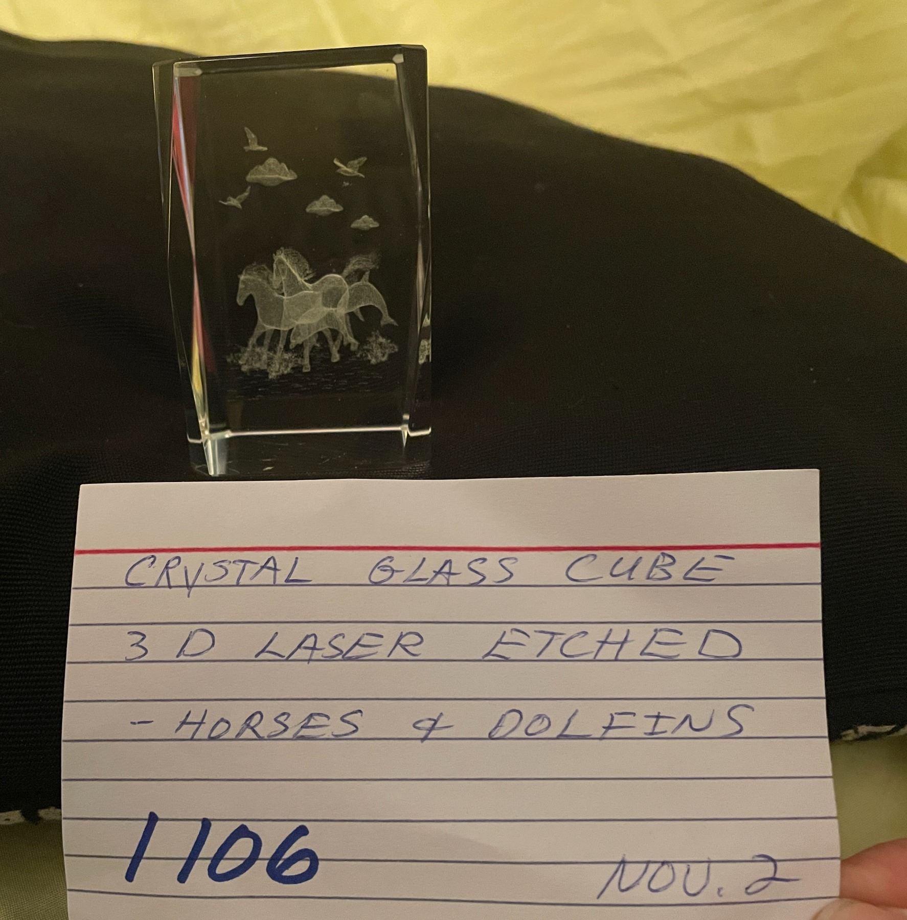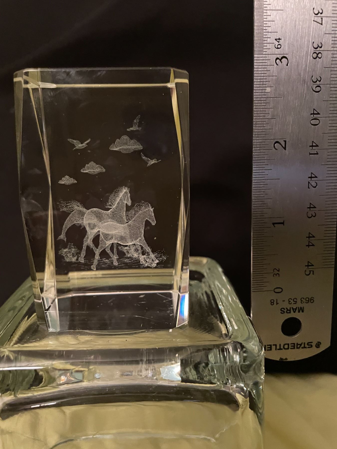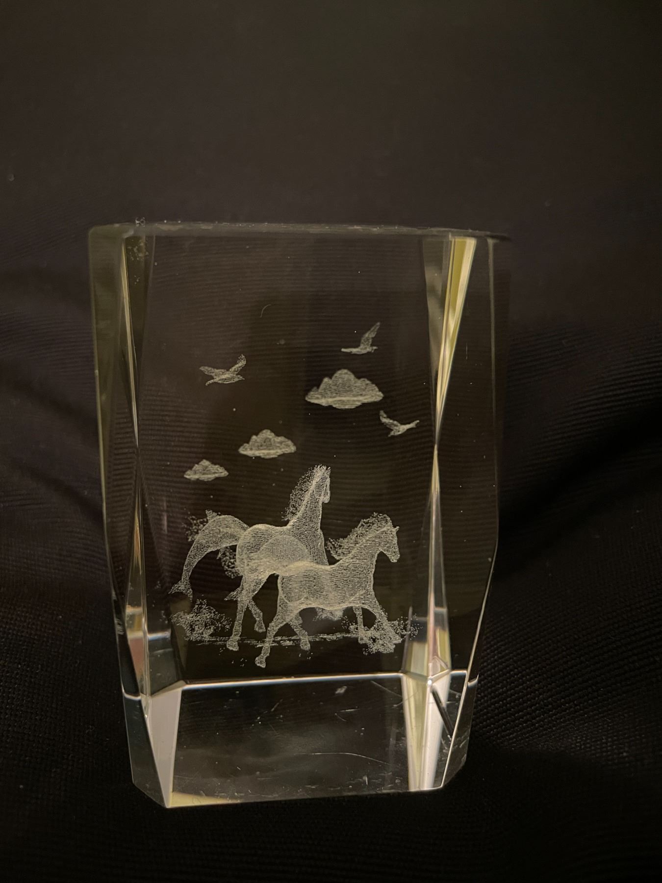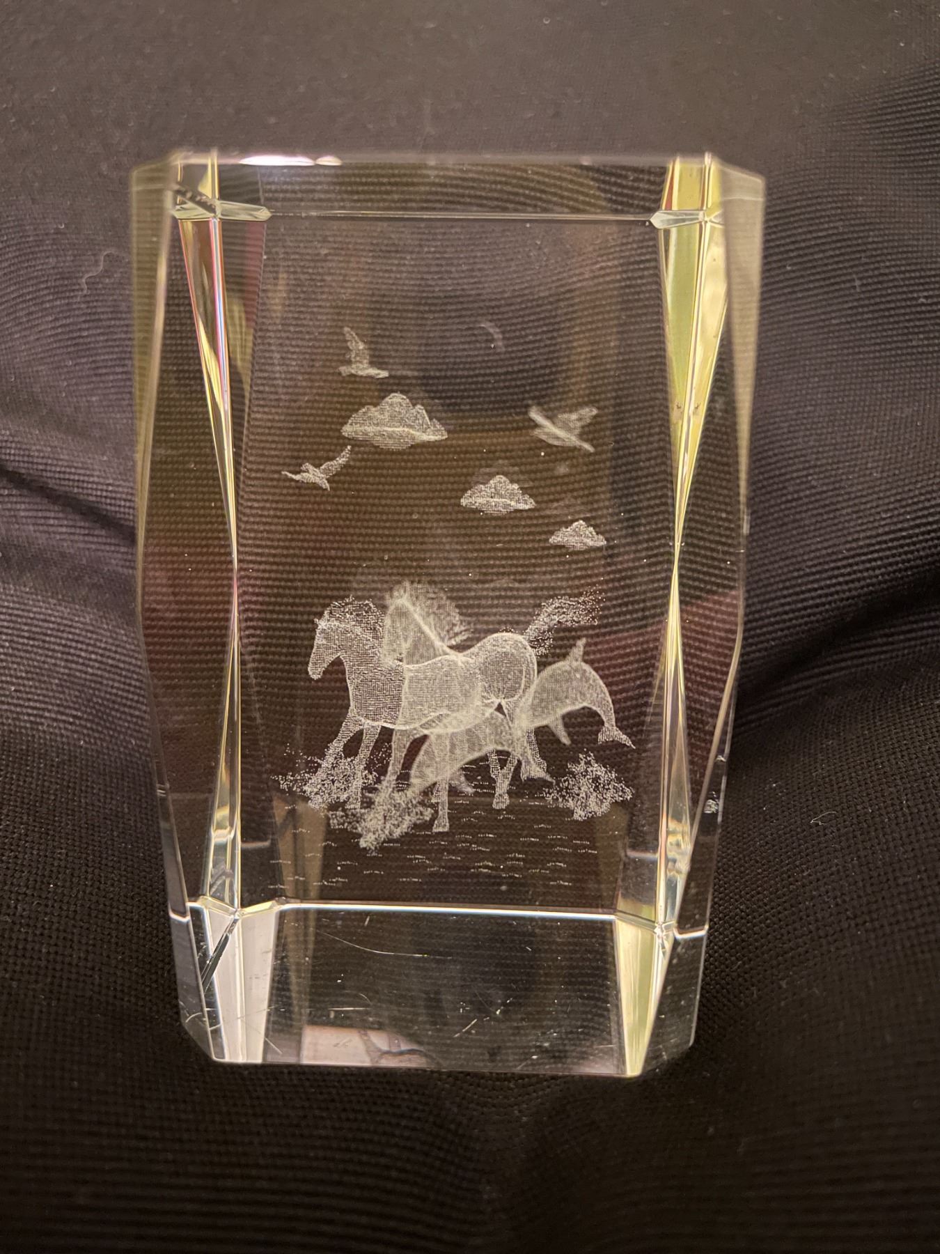 Glass cube horse dolphin etchings