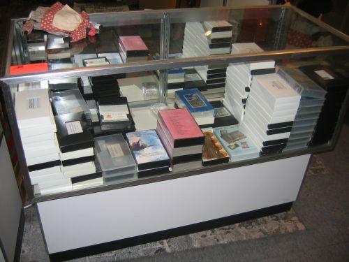 Glass display cabinet with assorted VHS and other types of tapes featuring Movieland Wax Museum.