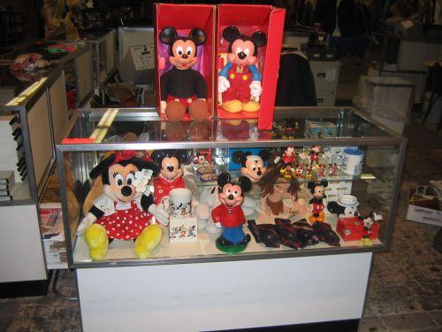Glass display cabinet with miscellaneous DISNEY merchandise (dolls, mugs, figurines etc)