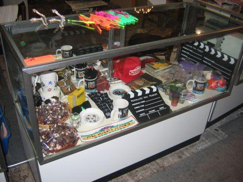 Glass display cabinet with miscellaneous Movieland Wax Museum souvenir items ([tin trays, stickers, penny-in-a-bottle, shotglass, ashtrays, toothpick holders, pins, pens, postcards, magnets, coffee cups, etc)