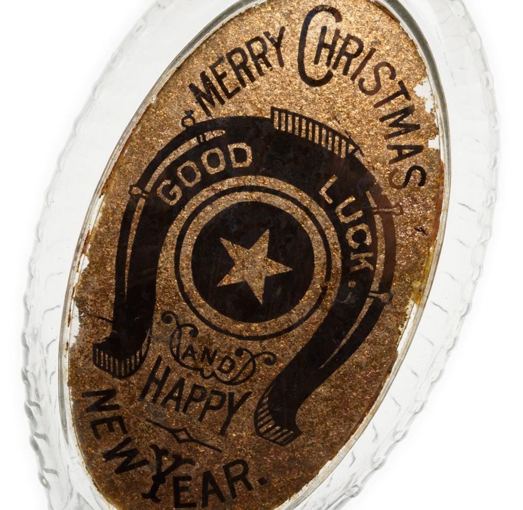 Glass flask with metal cap with gold reverse painted label: “Merry Christmas/Good Luck/Happy New Year” with Texas Star and harness; overall very good condition; ca turn-of-the 19th to 20th Century. Est.: $100-$200.