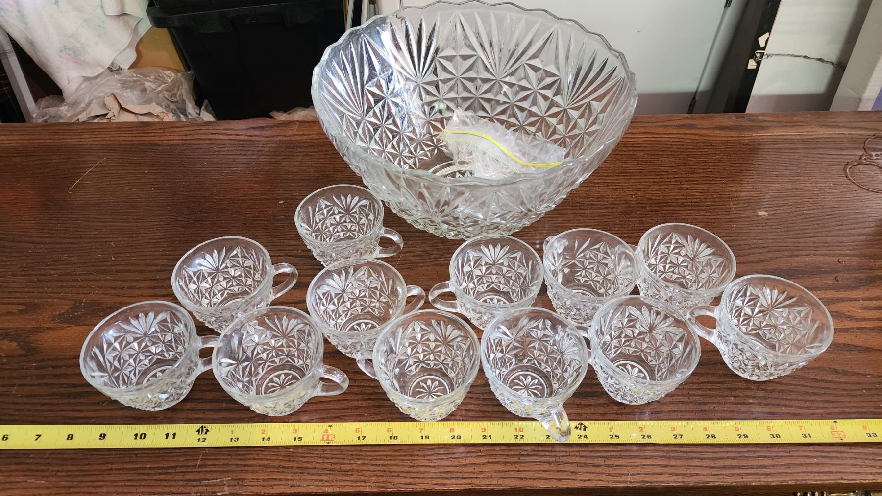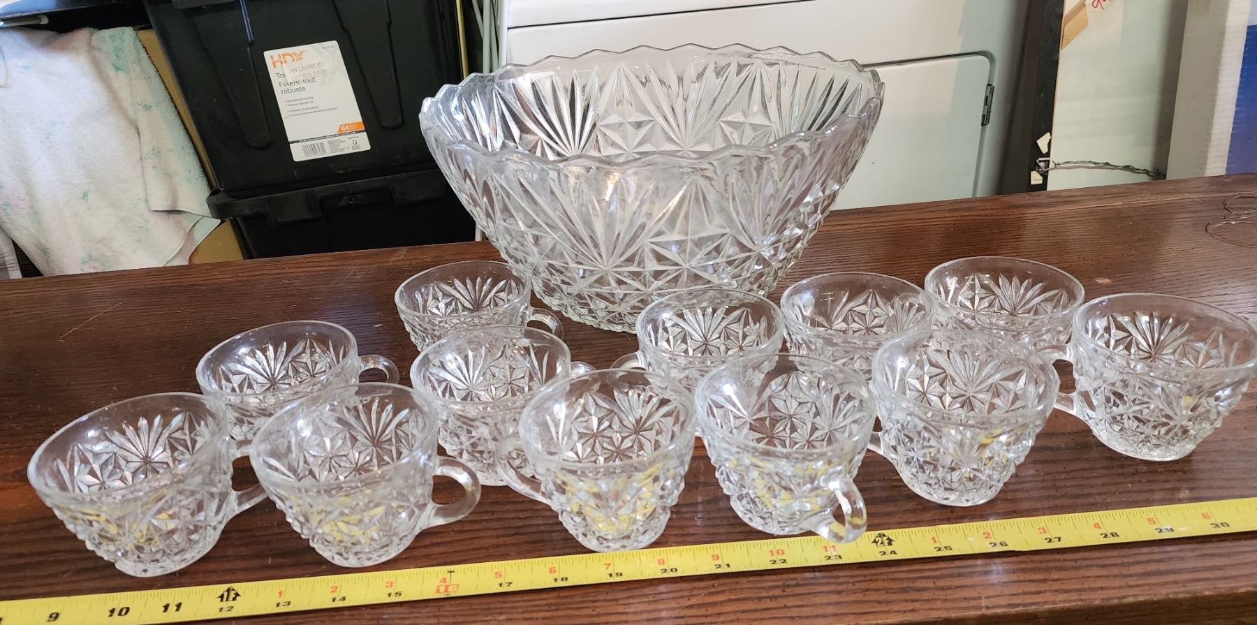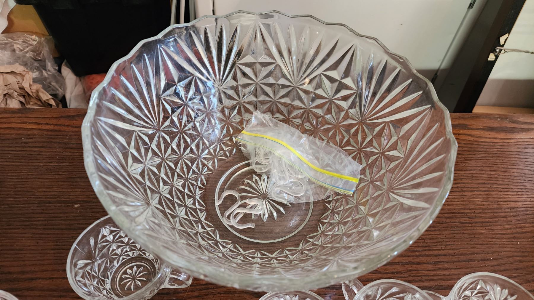 Glass punch bowl, and drinking glasses, comes with plastic hooks