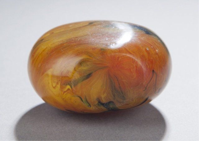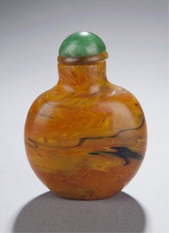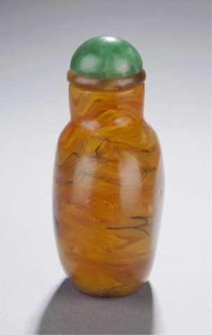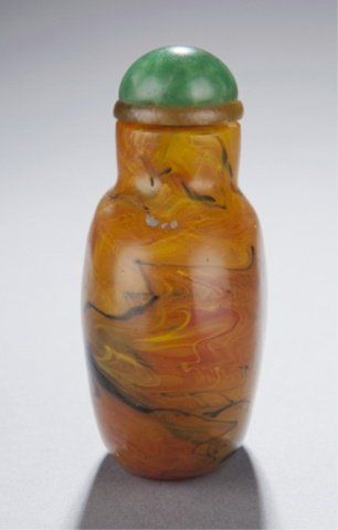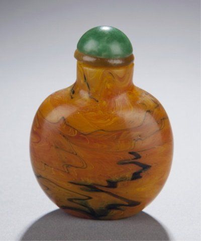 A glass snuff bottle with yellow, orange, and black striations throughout. 20th century. 2 1/4".