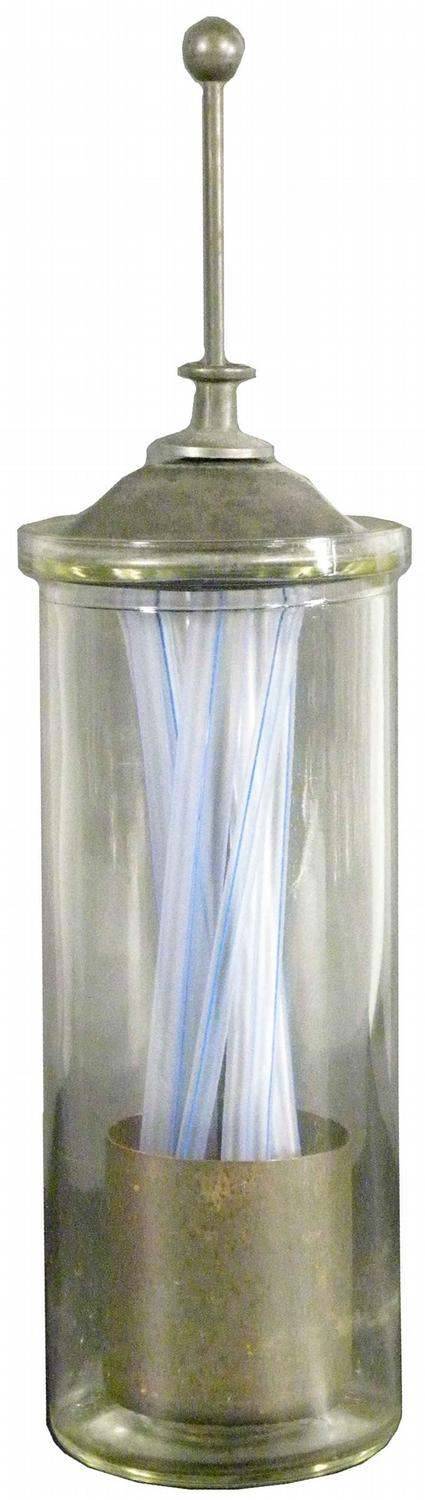 Glass straw holder with pressed steel elevator lid. Patent 1915. No chips or cracks. Very good condition. 12 inches tall.