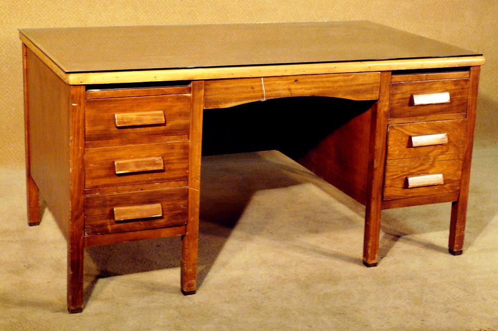 Seven drawer teacher's desk. Glass top protecting the wood.