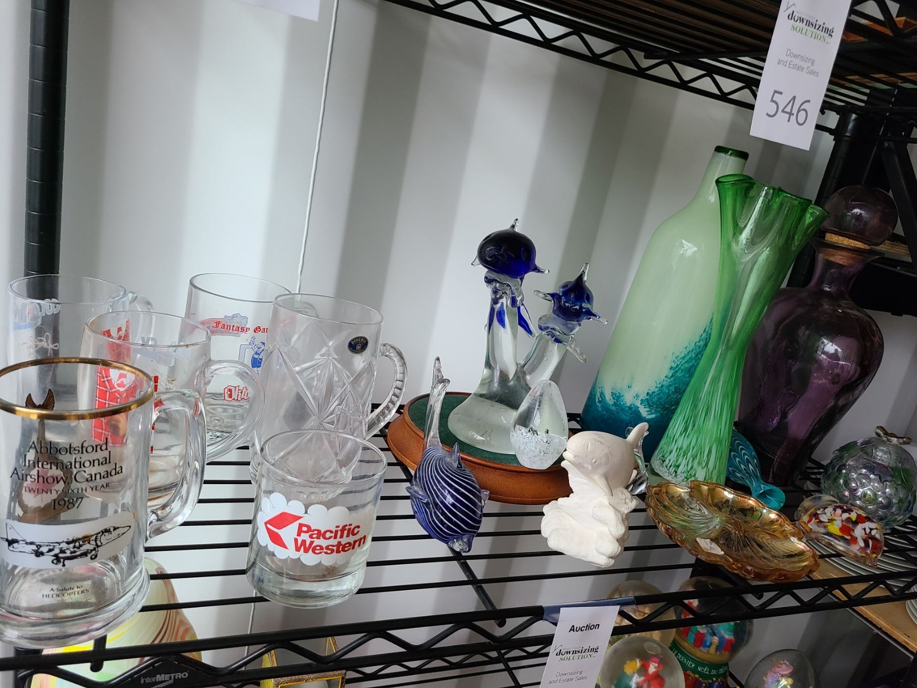 Lot includes glass mugs, paper weights, and vases. Bring packing material. Pickup at 9 am.