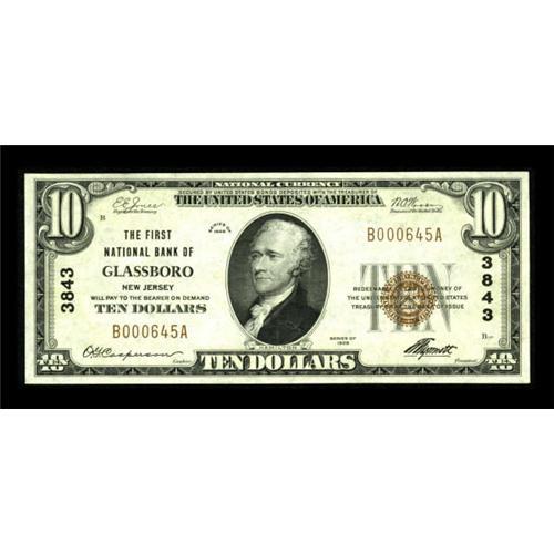 <B>Glassboro, NJ </B></I>- $10 1929 Ty. 1 <B>The First NB</B></I> Ch. # 3843<BR> A lovely note from this obscure Gloucester County location, best remembered for hosting the 1967 summit conference between President Lyndon Johnson and Soviet Premier Aleksei Kosygin. The meeting had proved difficult to schedule, with Kosygin favoring a meeting in New York and Johnson, seeking to avoid that location due to the likelihood of Vietnam War protests, proposing Washington. Meeting in metropolitan Glassboro, about equidistant between the two cities, proved a compromise amenable to all, although its real distance from the centers of power in this country was akin to scheduling a Russian hosted summit in Murmansk or Irkusk. Purchasing this note would be a perfect method of memorializing this significant Cold War milestone. Sharp <B>About Uncirculated,</B></I> and as nice as any example of any type recorded from this one bank town. <BR><I>From The John Ameen Collection</B></I><BR><BR><b>Shipping:</b> Coins & Currency (<a target="_blank" href="http://www.heritageauctions.com/common/shipping.php">view shipping information</a>)