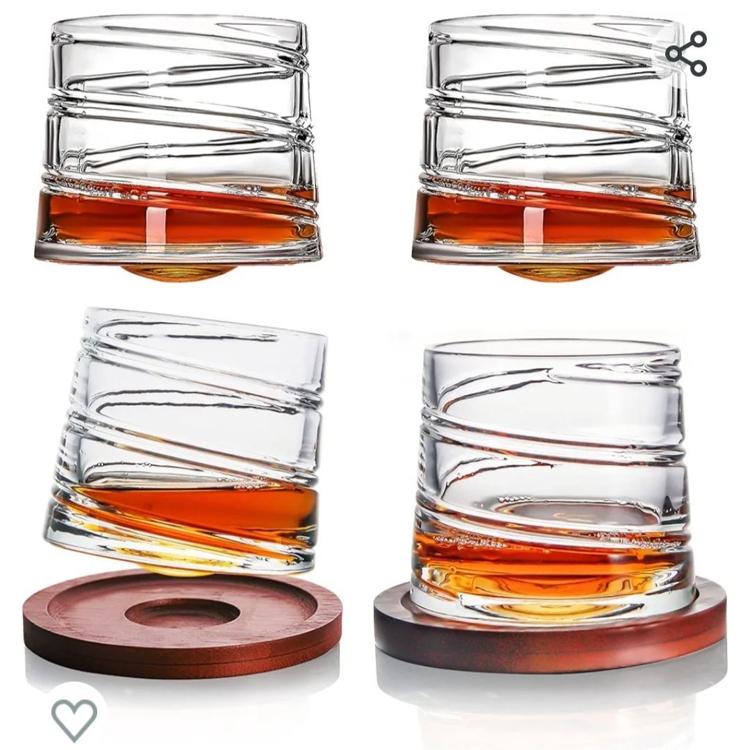 4-piece premium glassware with unique swirl design, includes wooden coasters, new.