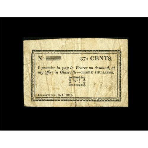 <B>Glassville, NY- P. Burns</B></I> 37 1/2¢ Oct. 1814 Harris 12<BR> A second extraordinarily rare and likely unique piece from this early New York issuer. Like the 18 3/4¢ example above, this piece is also denominated in shillings as well as cents. <B>Fine, </B></I>ex-Schingoethe collection sale of June, 2005, lot 249, where it realized $920, previous to that lot 887 of our Gordon Harris collection sale, Cincinnati, 2003. <BR><I>From The Collection of a Louisiana Gentleman.</B></I><BR><BR><b>Shipping:</b> Coins & Currency (<a target="_blank" href="http://www.heritageauctions.com/common/shipping.php">view shipping information</a>)