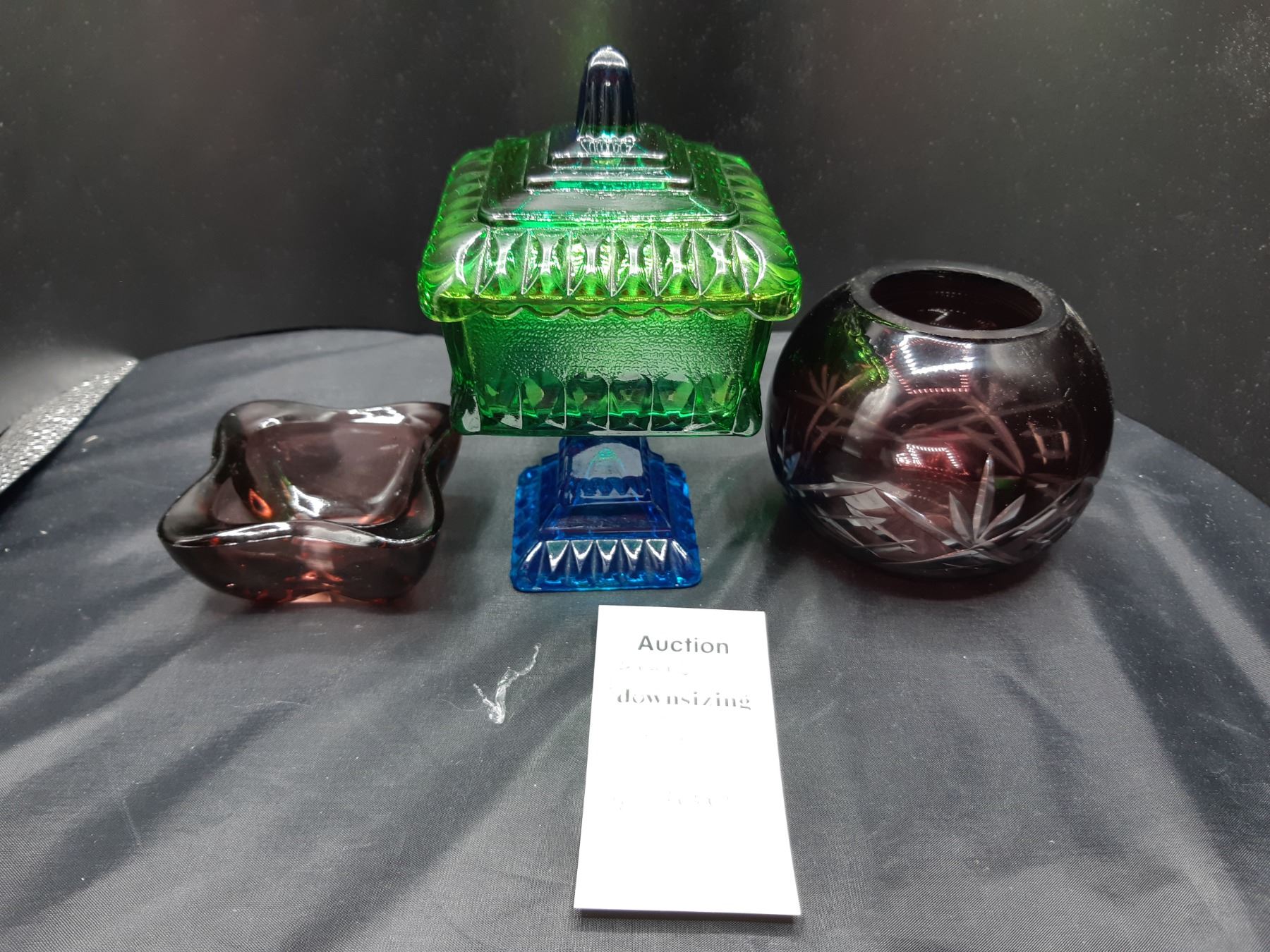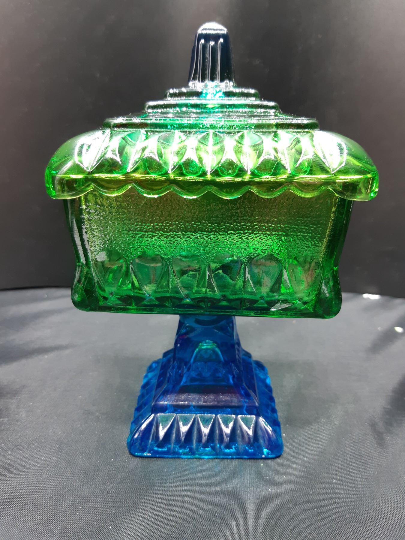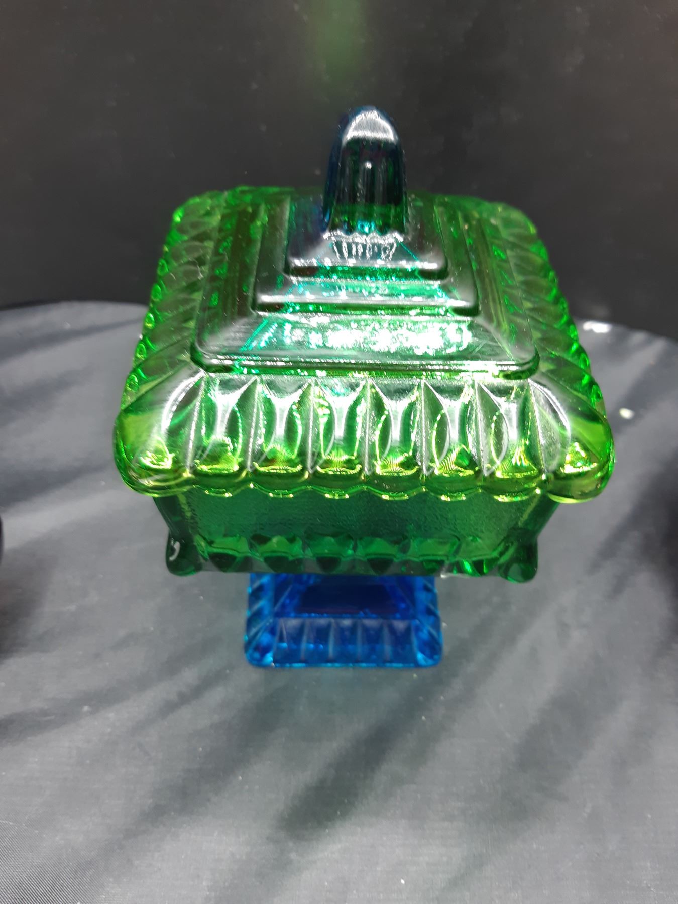 Green and blue fiited lidded container 4x4x6, round 4" and sq 3x3x2 Bring packing materials and pickup at 19am