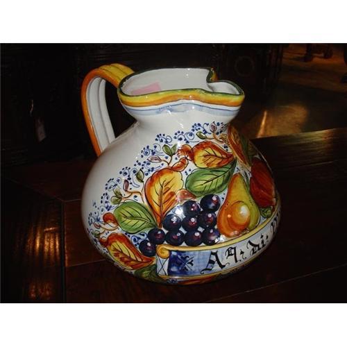 This large colorful Italian pitcher will brighten any spot you place it. With a white background, it pictures grapes, a pear, and leaves on the front. It is hand written "Made in Italy" on the bottom.