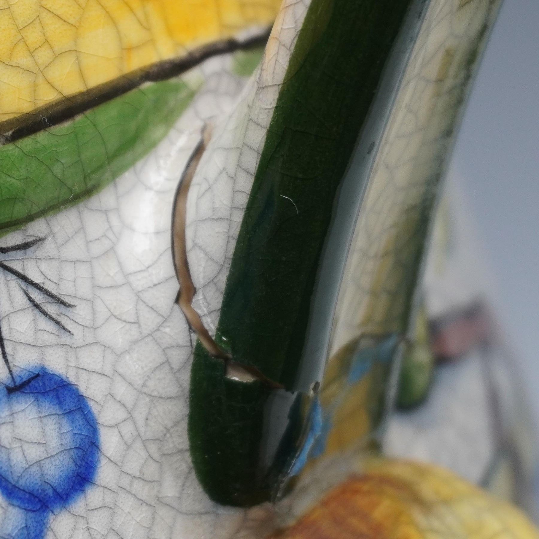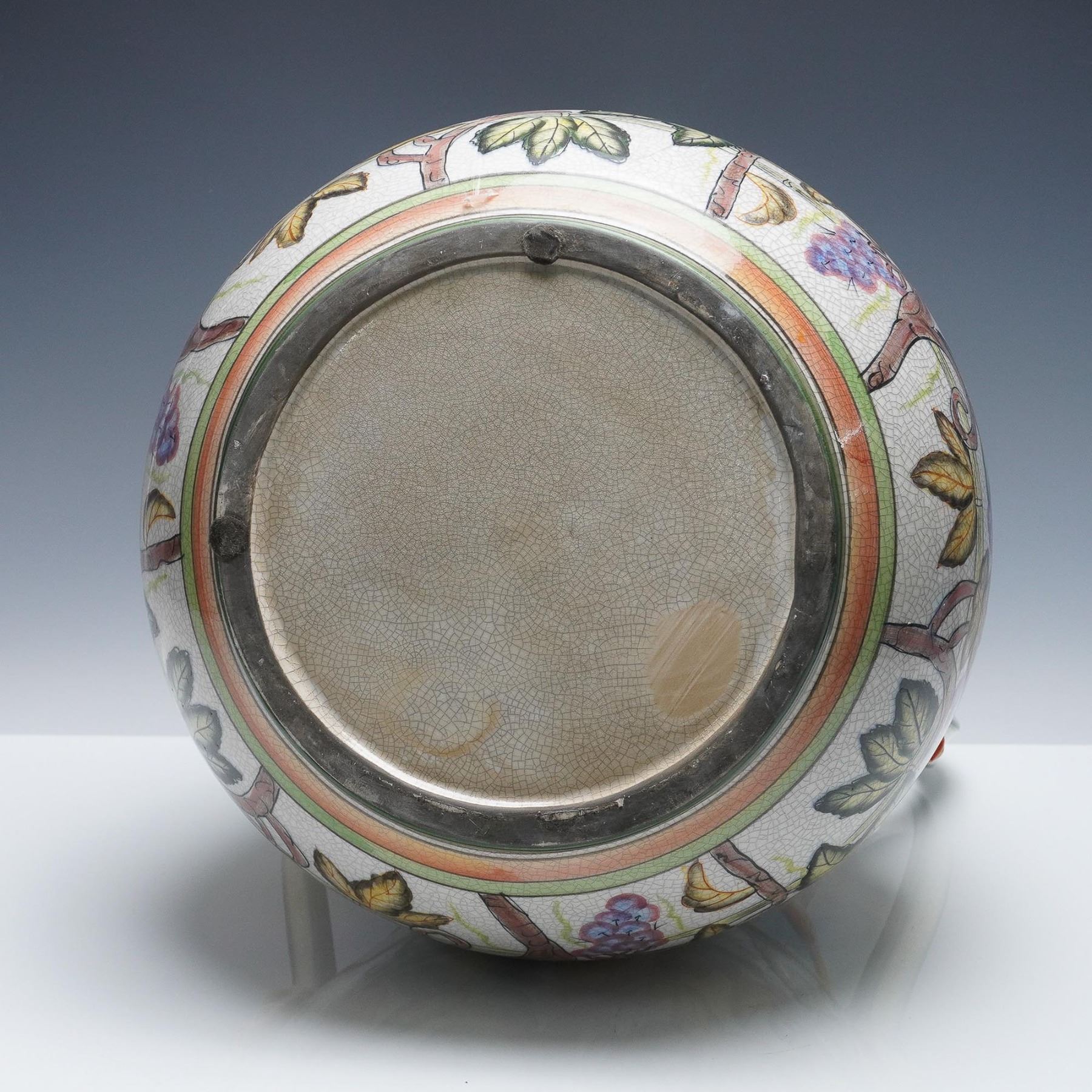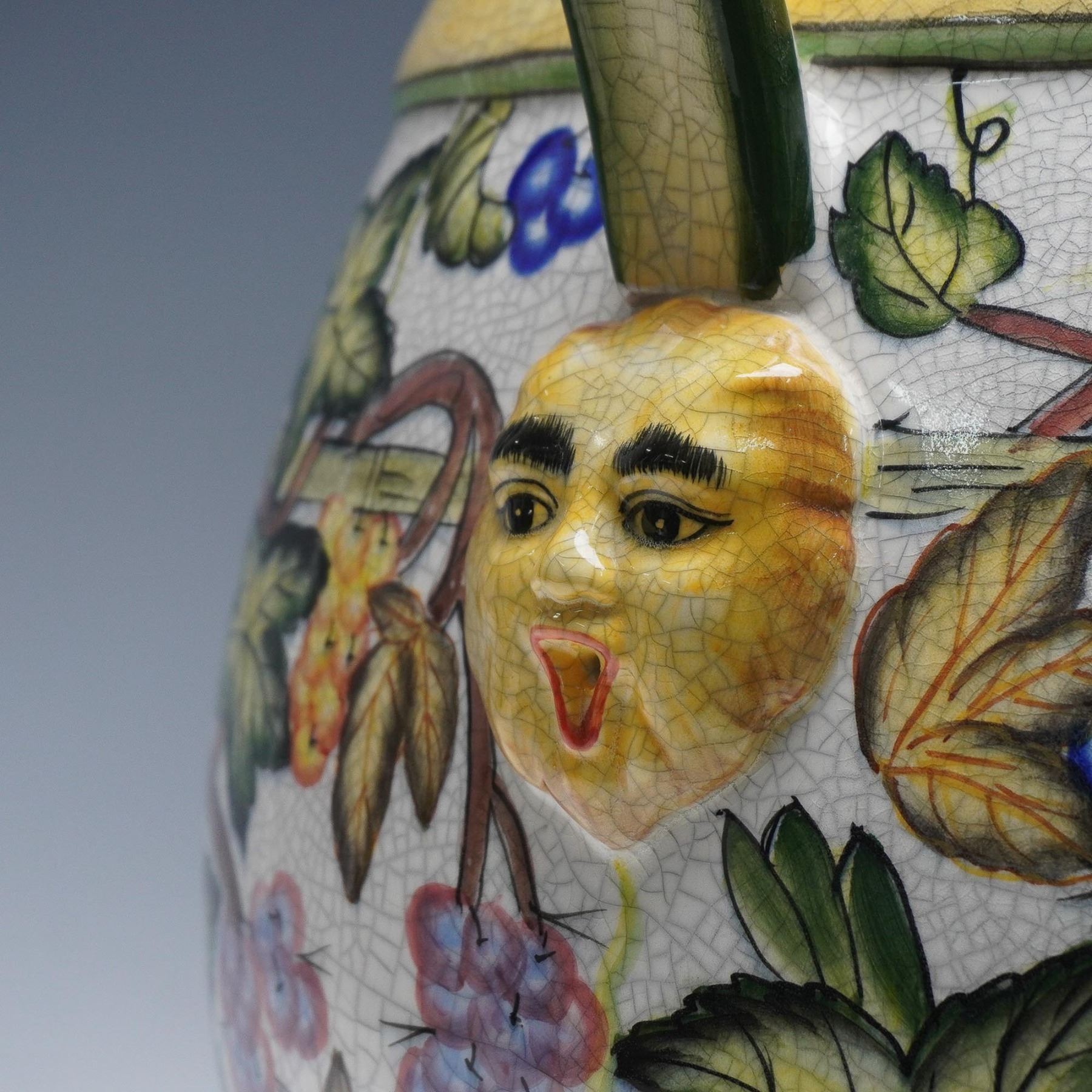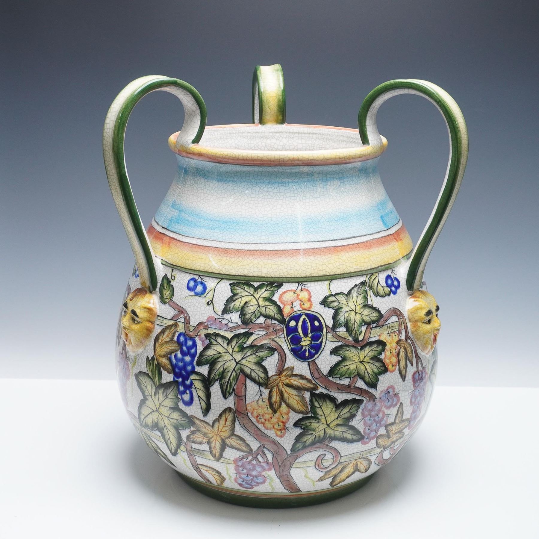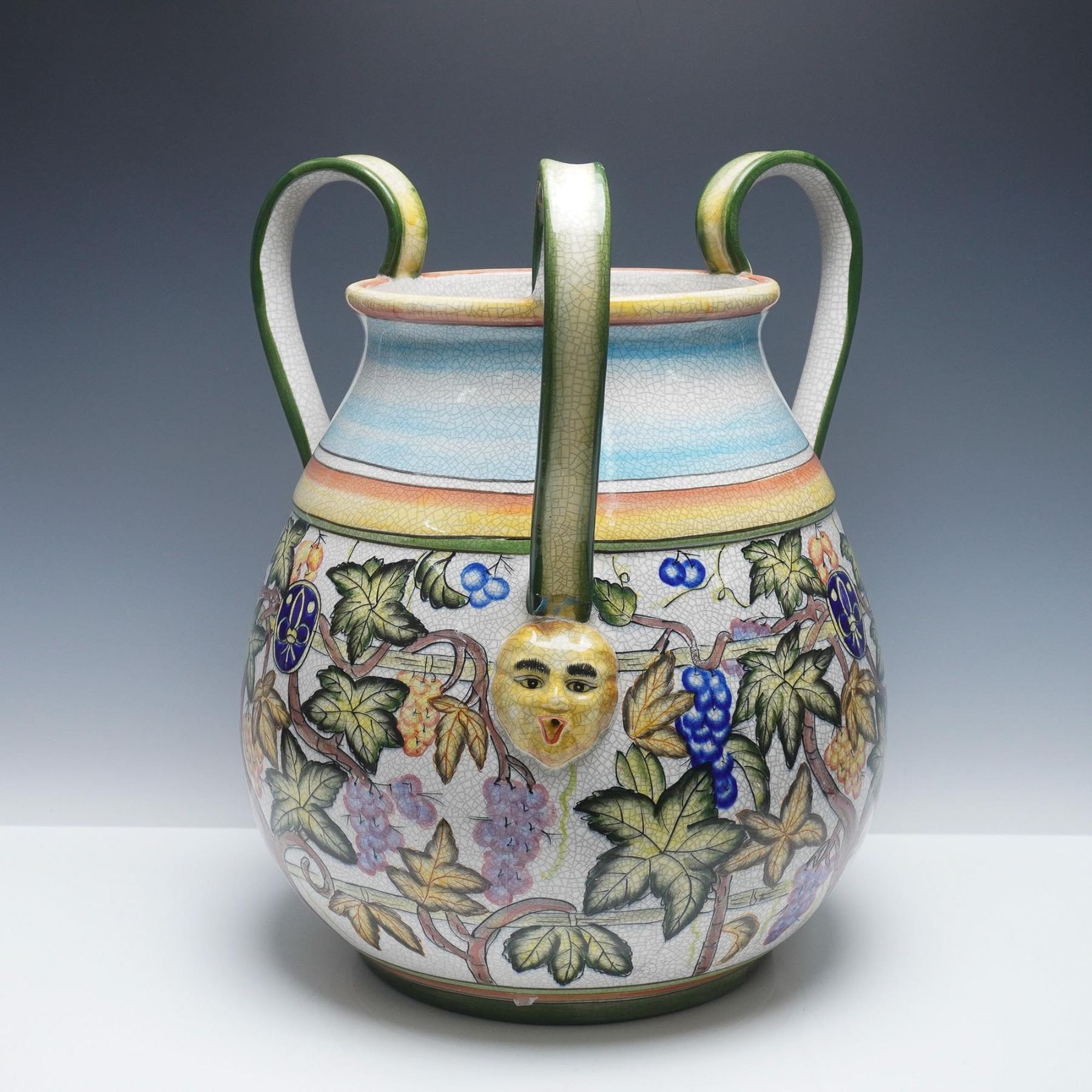 Colorful glazed ceramic wine vessel featuring four sinuous green handles and raised yellow masks at each handle base. The body is decorated with an ornate grapevine motif in rich hues of blue, orange, green, and gold, with craquelure glaze throughout. A blue crest appears among the vines, and the vessel rests on a rounded foot with metal band reinforcement. One handle has visible damage at the attachment point. Likely Italian majolica, late 19th to early 20th century.