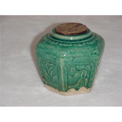 Green glazed pottery vessel with cork stopper, 3 3/4" tall x 4 1/2" in diameter. All over crazing. Unmarked, a Chinese ginger jar, found near Placerville where there was a very large Chinese population during the Gold Rush.