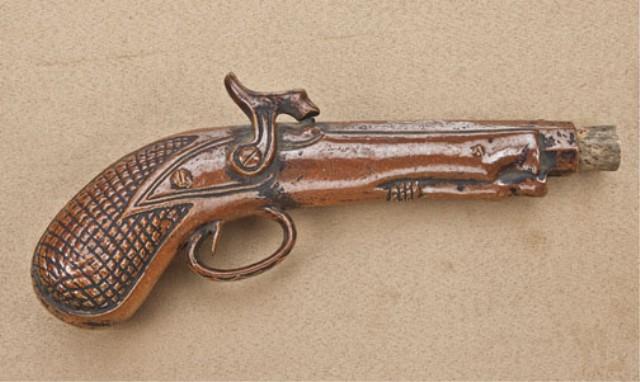 Glazed pottery liquor bottle, 19th to early 20th century showing Deringer pistol. Approx. 10-1/2”, very good condition, some rub to the glaze where it was hung on a wall or carried as a flask. A very interesting piece of Americana. From the William R. Orbelo Collection. Est: $300 - $600