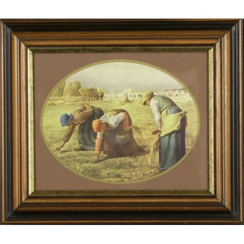 This is a print of Millet?s ?Gleaners? that displays all the rich golden colors of the original. These colors are subtly balanced by blues and reds that the women are wearing bringing attention to them as the center of interest. Beautifully matted in a red clay mat and framed in a stained wood frame. This attractive piece measures 11? x 13?.